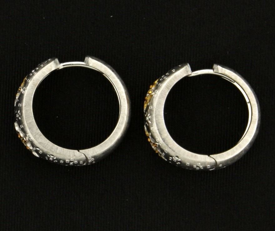 In 18k white and yellow gold. Contains .1ct TW of high quality diamonds of VS clarity/G color. 5/8 inch diameter. 8.6g.