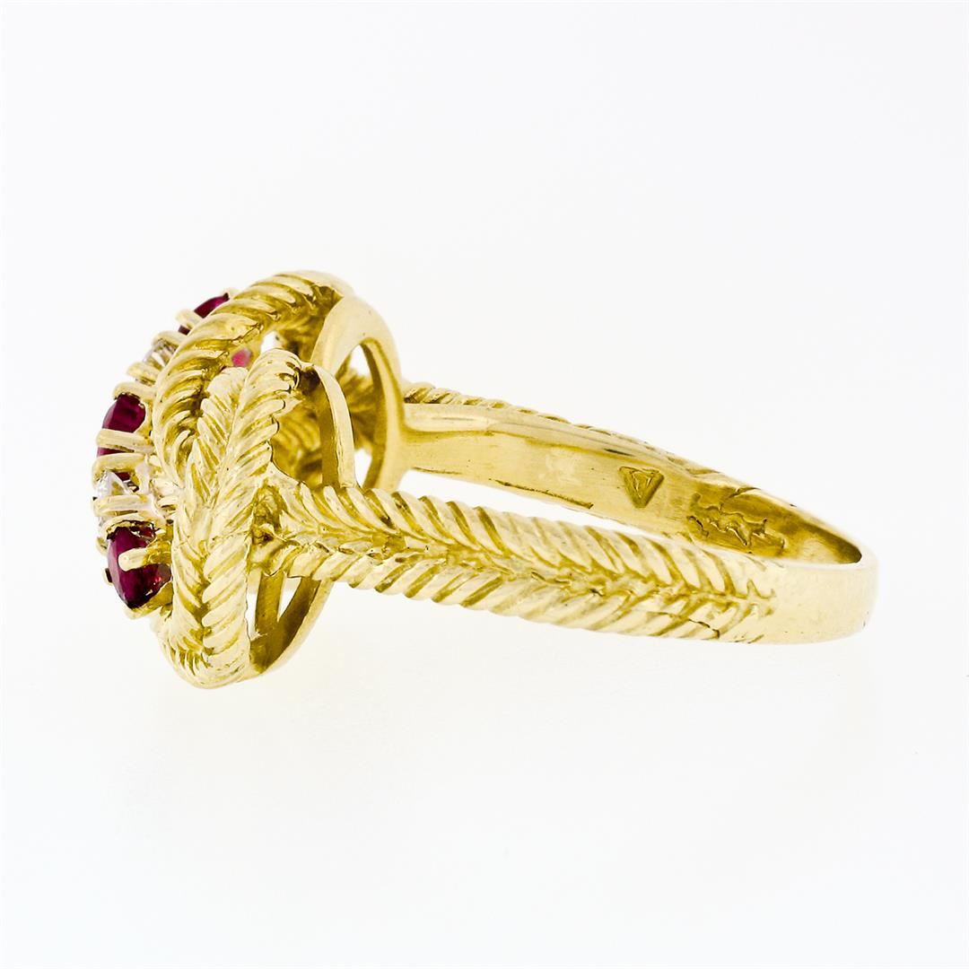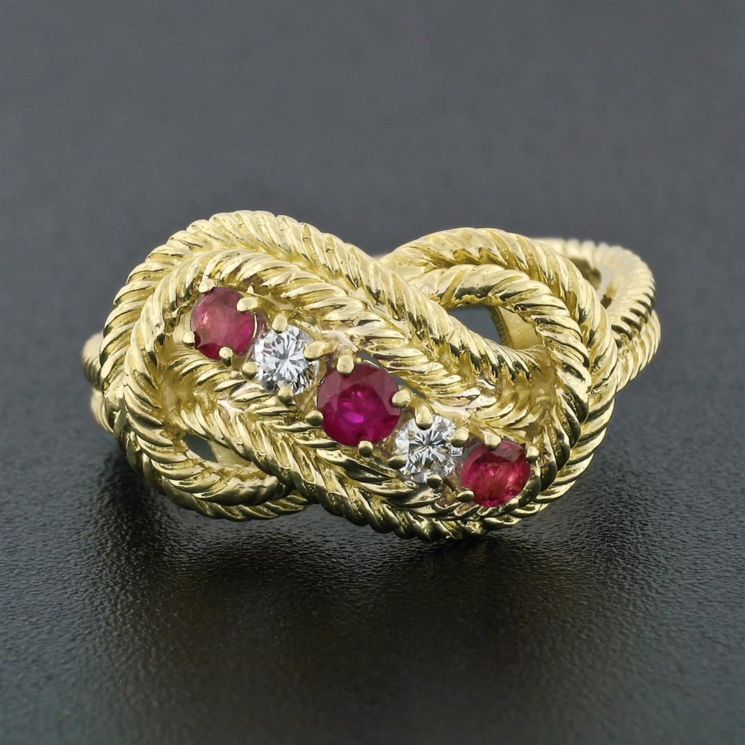 An estate solid 18k yellow gold braided knot ring, with 3 round cut natural rubies (0.38ctw), and 2 round brilliant cut natural diamonds (G - VS2 ; 0.12ctw). The ring is size 9, weighs a total of 7.34 grams, and measures 11.95mm wide.