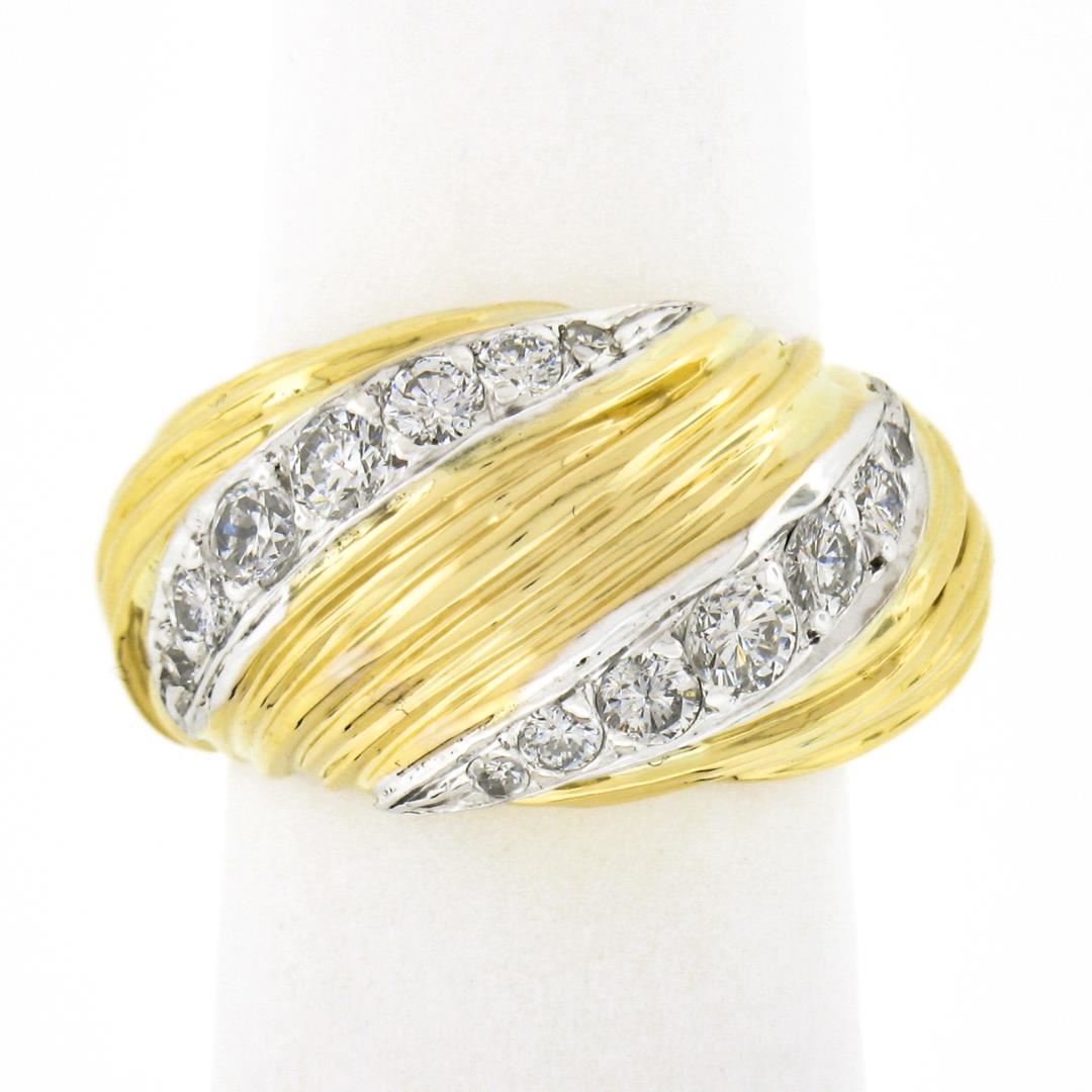 A solid 18k yellow & white Gold bombe ring, with 14 round cut natural diamonds (G-I - VS2-SI2 ; 0.56ctw). The ring is size 4.5, weighs a total of 9.47 grams, and measures 12.4mm wide.