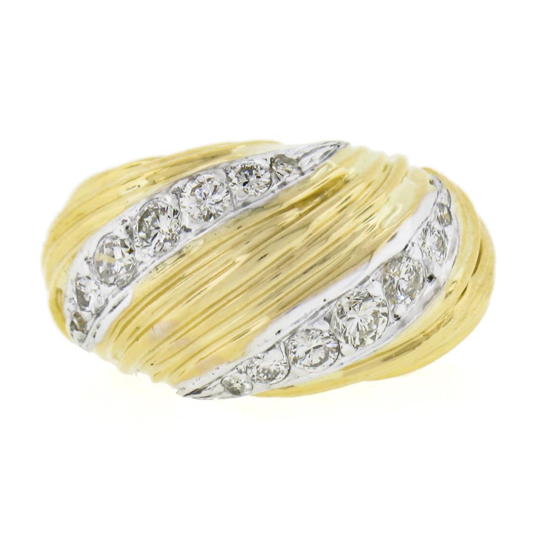 A solid 18k yellow & white Gold bombe ring, with 14 round cut natural diamonds (G-I - VS2-SI2 ; 0.56ctw). The ring is size 4.5, weighs a total of 9.47 grams, and measures 12.4mm wide.