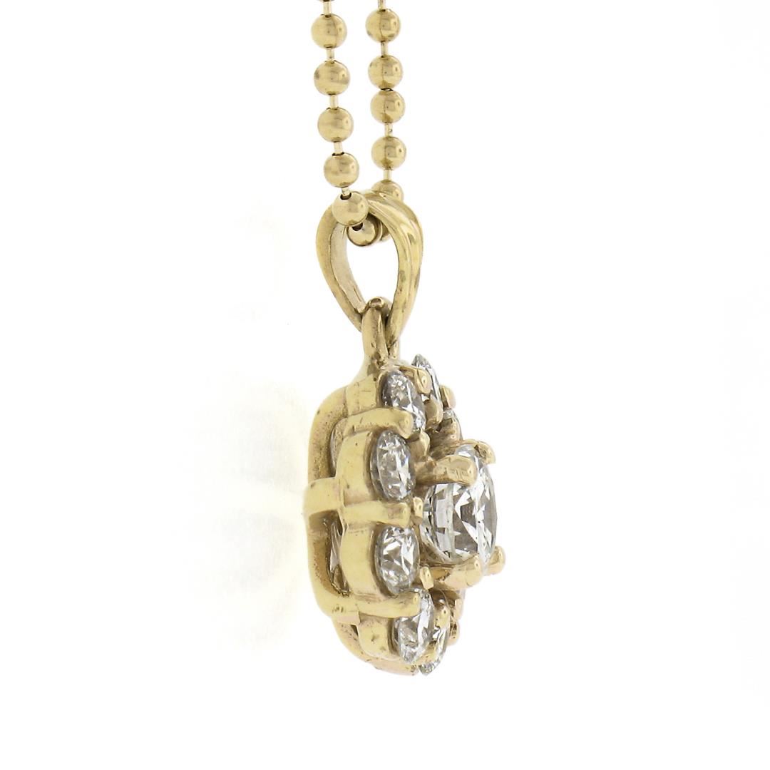 A solid 18k yellow gold pendant necklace, with 1 round cut natural diamond (G-I - SI1 ; 0.44ct), surrounded with 8 round cut natural diamonds (G-I  - VS1-SI1 ; 0.60ct). 18 inch bead ball link chain, 4.56 grams total weight, pendant measures 16.2x11.1mm.