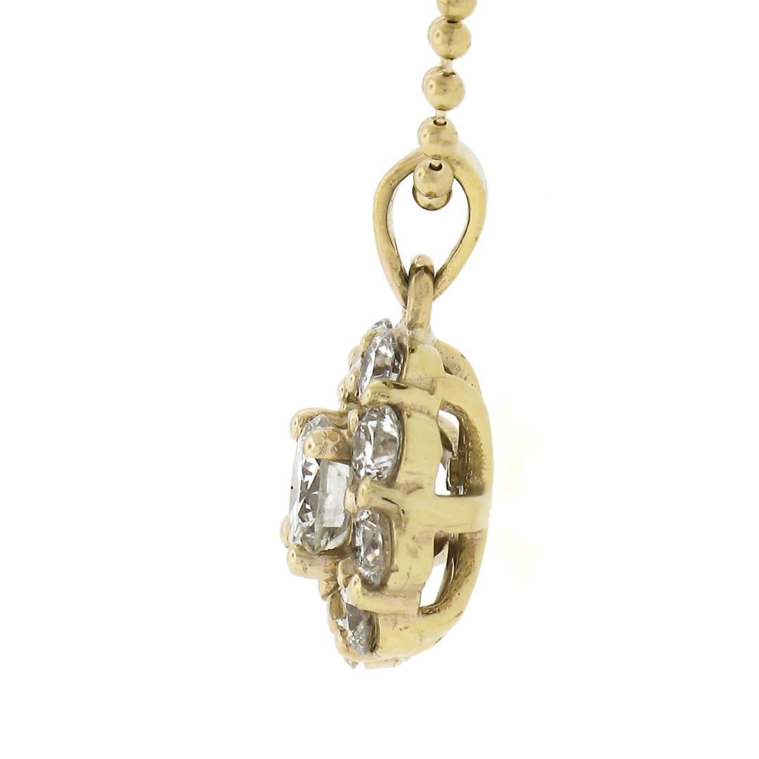 A solid 18k yellow gold pendant necklace, with 1 round cut natural diamond (G-I - SI1 ; 0.44ct), surrounded with 8 round cut natural diamonds (G-I - VS1-SI1 ; 0.60ct). 18 inch bead ball link chain, 4.56 grams total weight, pendant measures 16.2x11.1mm.