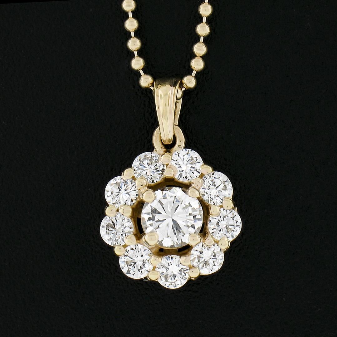 18k Yellow Gold 1.04 ctw Round Diamond Cluster Pendant 18" Bead Ball Necklace