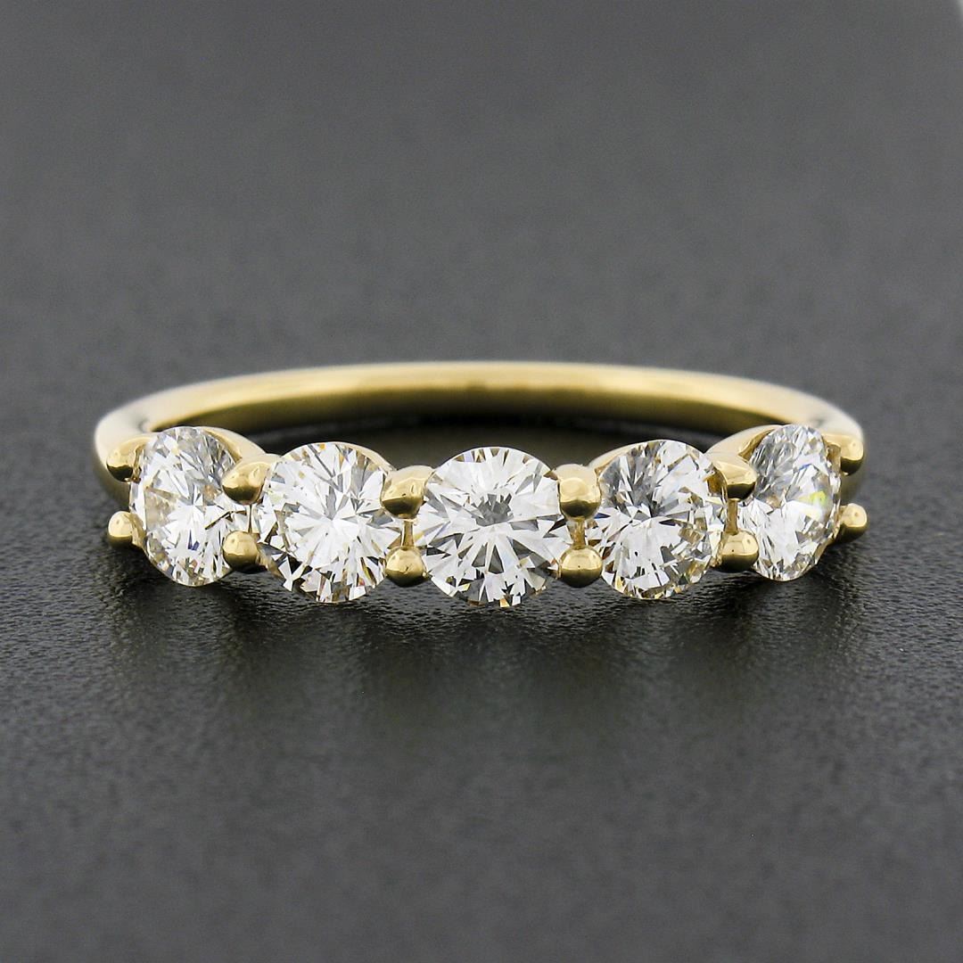 A new solid 14k yellow gold band ring, with 5 round ideal cut natural diamonds (F/G Color - VS1/VS2 ; 1.22ctw). The ring is size 6.5, weighs a total of 2.94 grams, and measures 4.1mm wide.