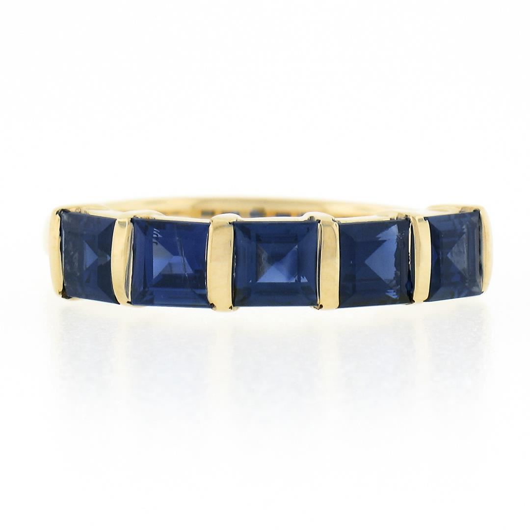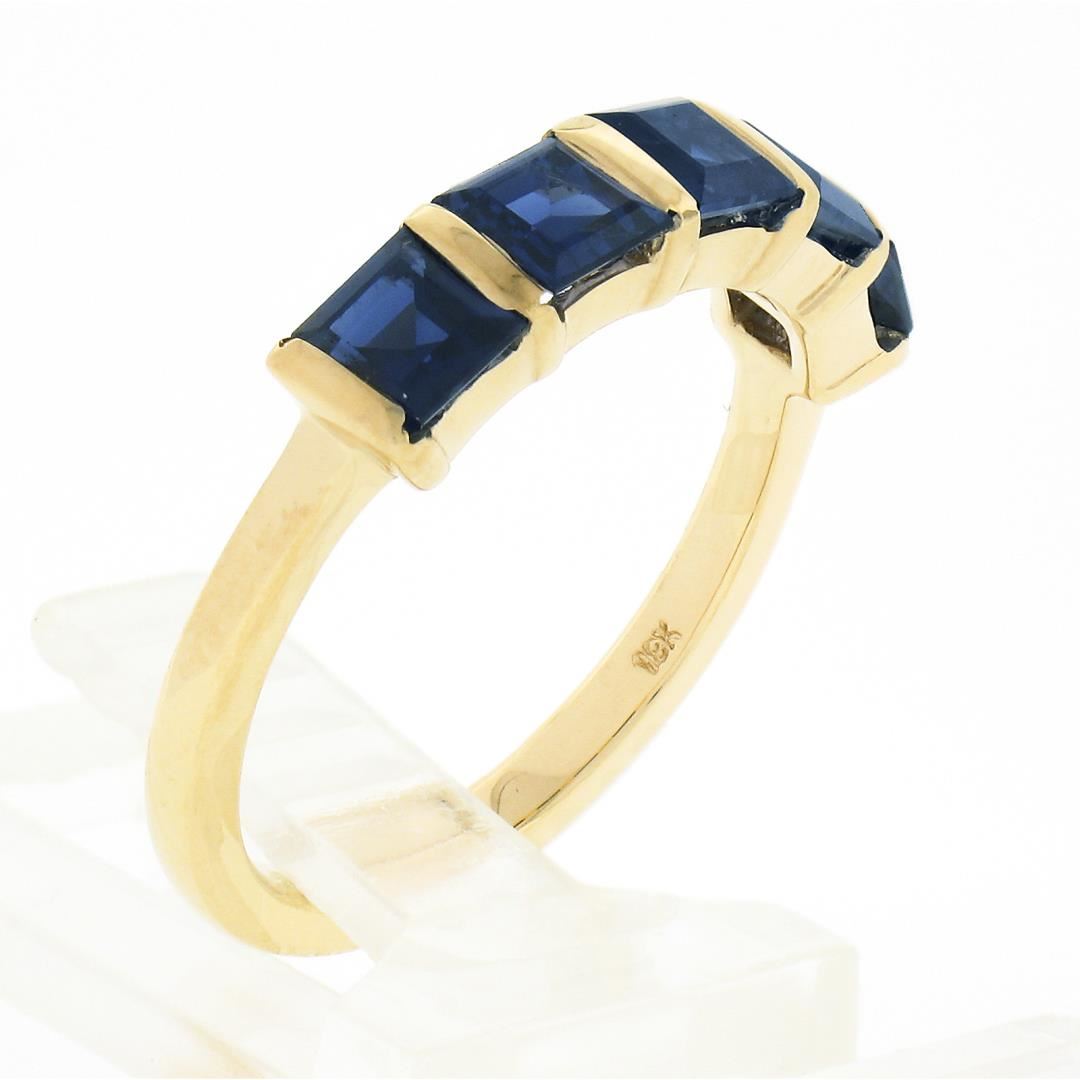 A solid 18k yellow gold 5 stone ring, with 5 square cut natural sapphires (1.75ctw). The ring is size 6.5, weighs a total of 3.86 grams, and measures 4.30mm wide.