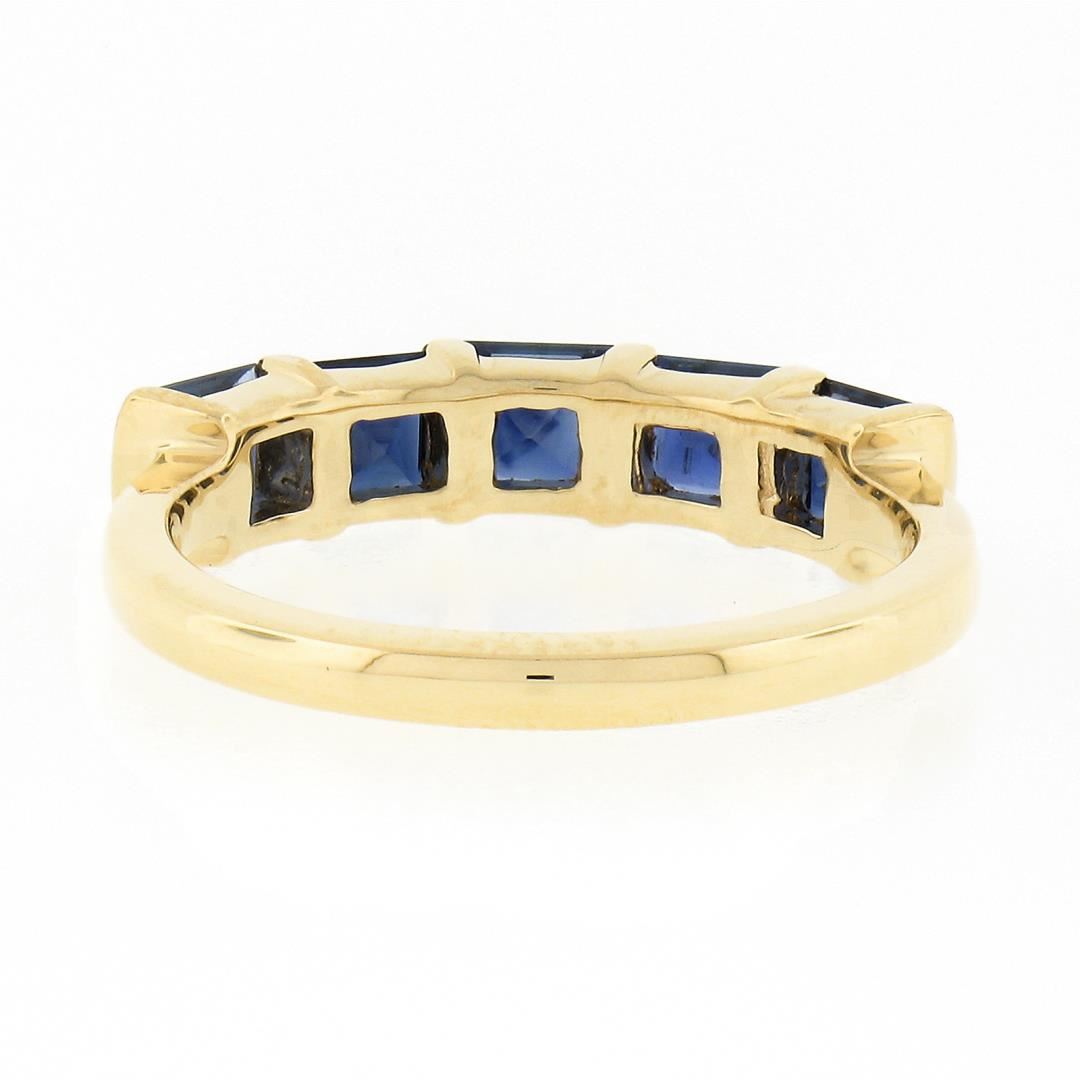 A solid 18k yellow gold 5 stone ring, with 5 square cut natural sapphires (1.75ctw). The ring is size 6.5, weighs a total of 3.86 grams, and measures 4.30mm wide.