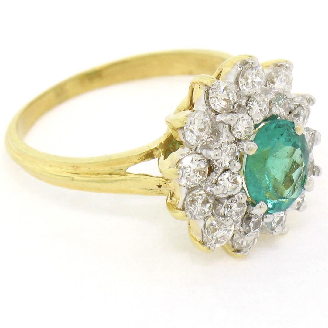 18k Yellow Gold 1.83ctw Oval Colombian Emerald Solitaire Dual Diamond Halo Ring. Please see photos and description for all available information. An estate solid 18k yellow and white gold solitaire ring, featuring 1 oval cut natural emerlad (0.83ct), surr