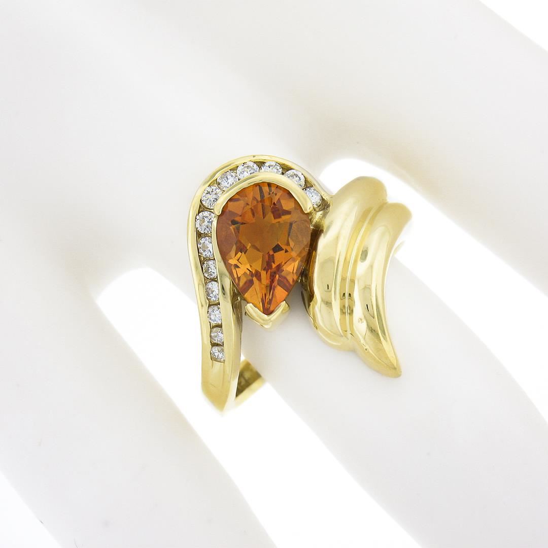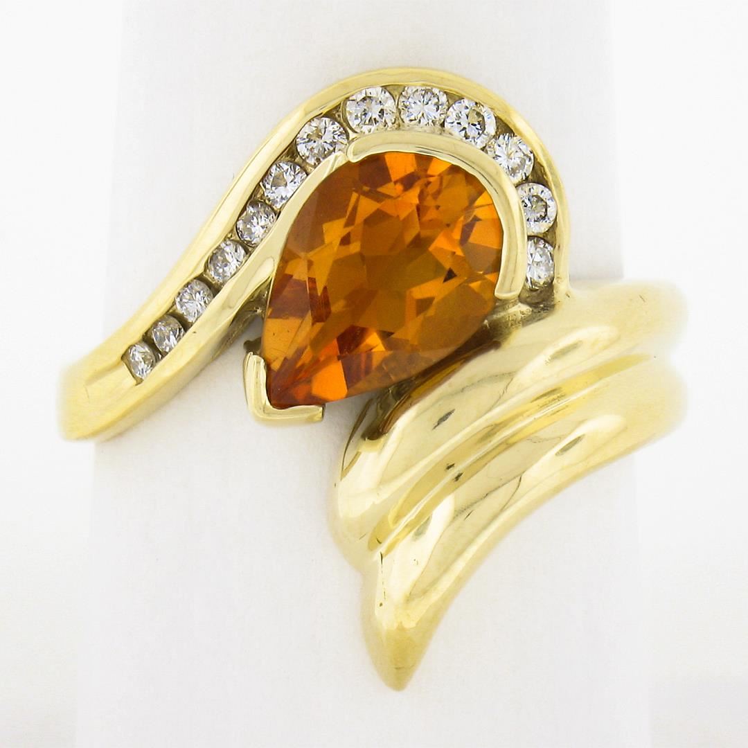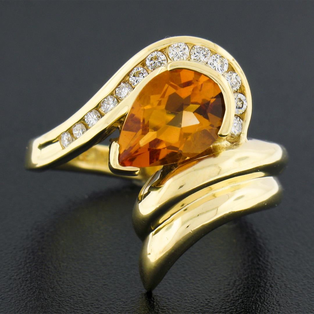 A solid 18k yellow gold ring, with 1 pear cut natural citrine (9.8x7mm / 1.70ct), and 13 round cut natural diamonds (G/H - VS1/VS2 ; 0.28ctw ). The ring is size 8.5, weighs a total of 8.81 grams, and measures 20.7mm wide.