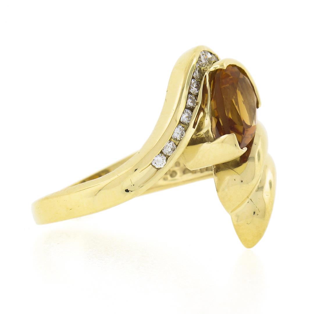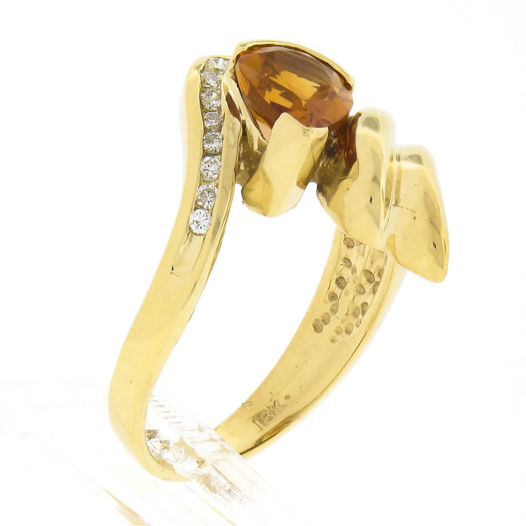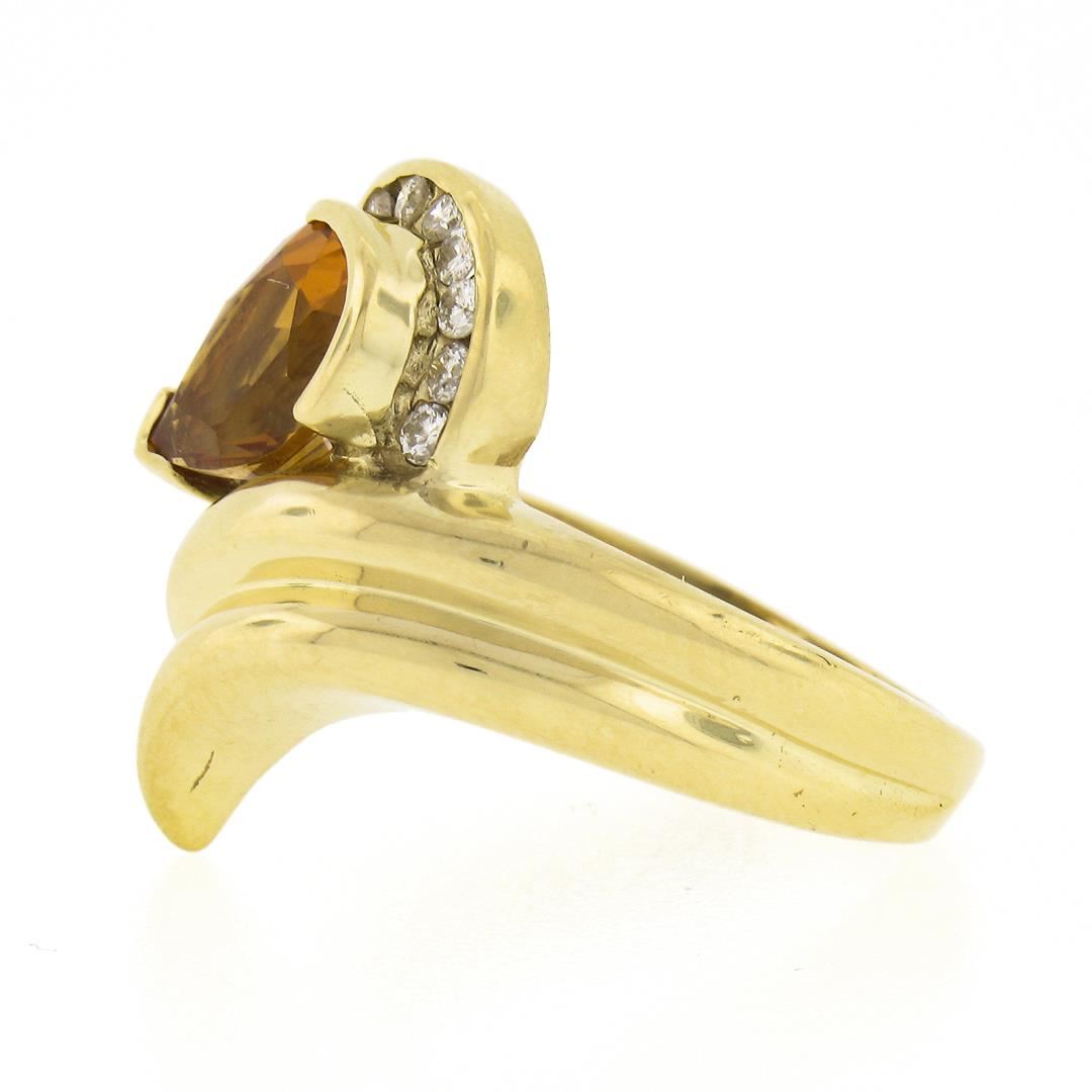 A solid 18k yellow gold ring, with 1 pear cut natural citrine (9.8x7mm / 1.70ct), and 13 round cut natural diamonds (G/H - VS1/VS2 ; 0.28ctw ). The ring is size 8.5, weighs a total of 8.81 grams, and measures 20.7mm wide.