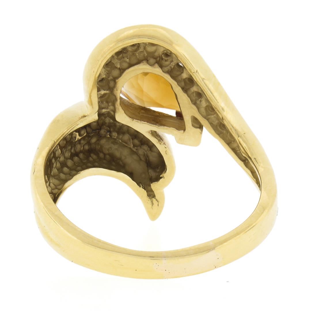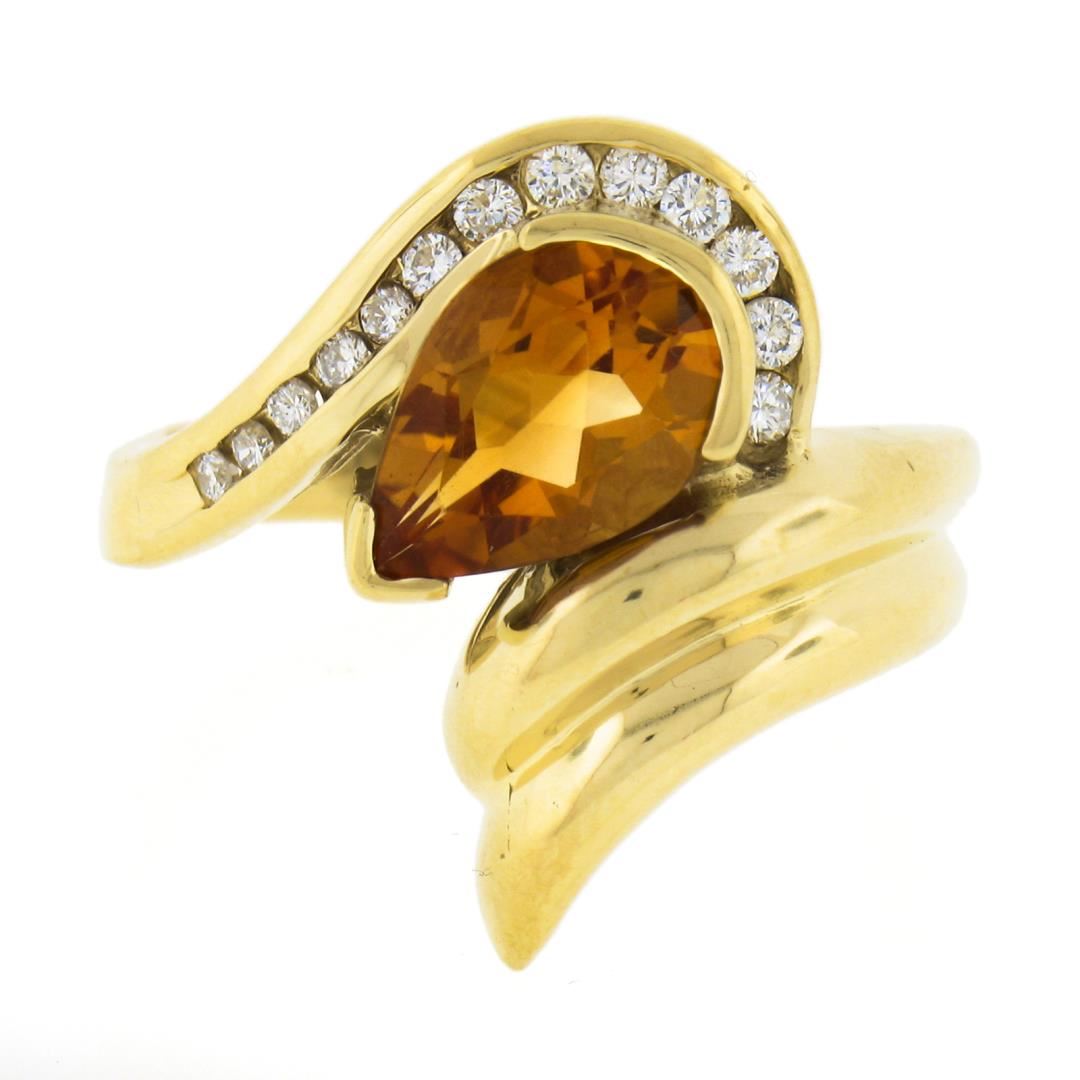 A solid 18k yellow gold ring, with 1 pear cut natural citrine (9.8x7mm / 1.70ct), and 13 round cut natural diamonds (G/H - VS1/VS2 ; 0.28ctw ). The ring is size 8.5, weighs a total of 8.81 grams, and measures 20.7mm wide.
