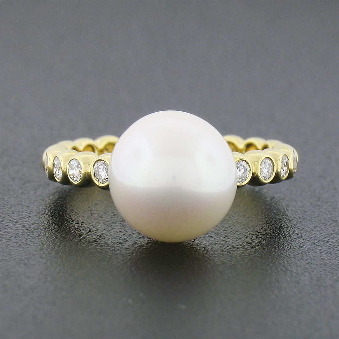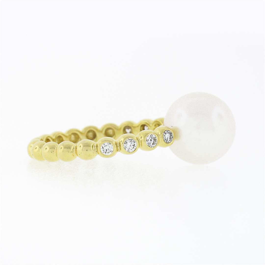 A solid 18k yellow gold solitaire ring, with 1 round bead shape cultured pearl (10.5mm), and 8 round brilliant cut natural diamonds (G/H - VS1/VS2 ; 0.36ctw). The ring is size 8.0, weighs a total of 4.59 grams, and measures 3.0mm wide.