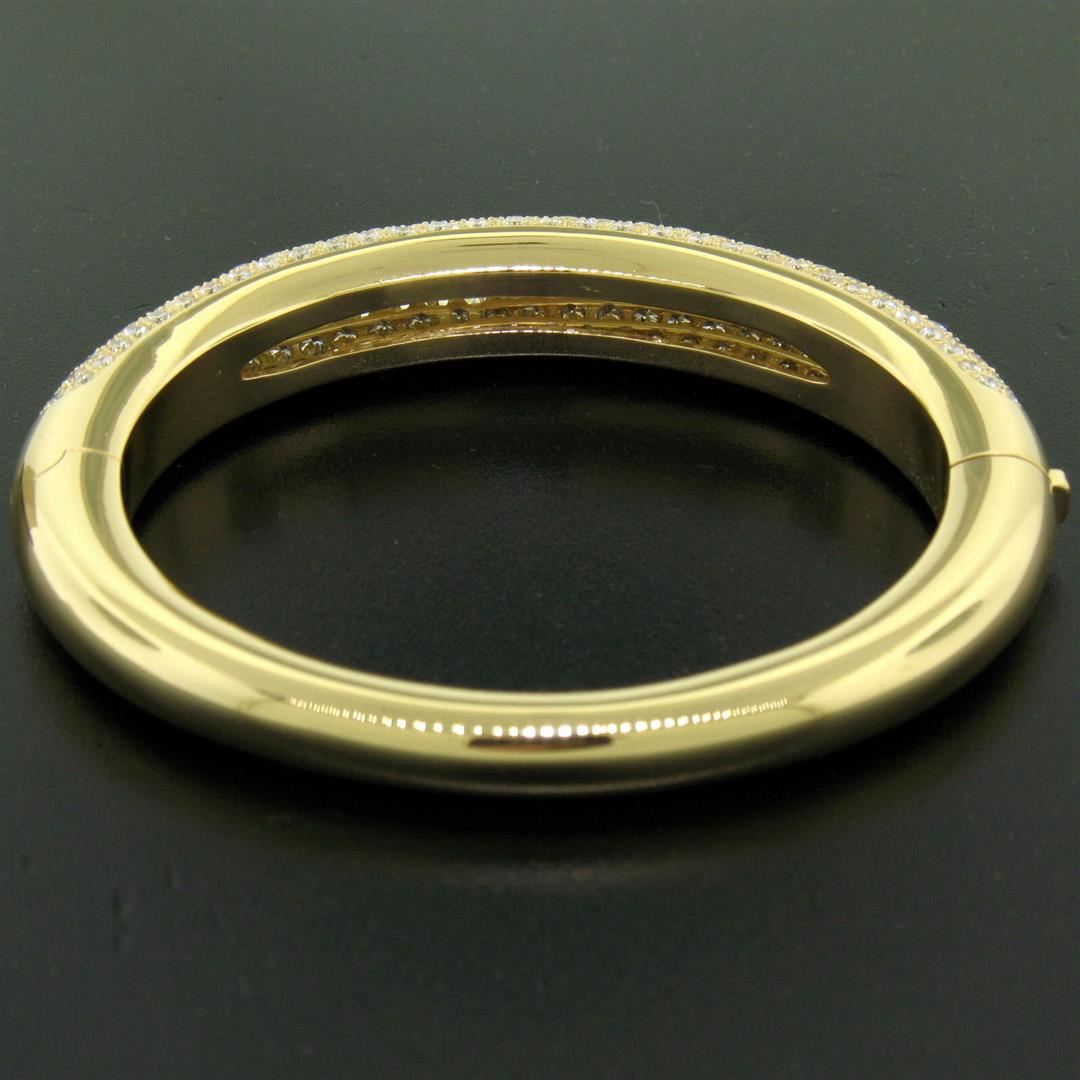 One FIERY 18k Yellow Gold 15.90ctw Pave Set F VS Round Diamond Dome Bangle Bracelet. Item Details - Material: Solid 18k Yellow Gold, Weight: 47.4 Grams, Stone(s): (233) Natural Genuine Diamonds - Round Brilliant Cut - Pavé Set - F/G Color - VS1/VS2 Clarity, Total Carat Weight: 15.90 (approx.), Type: Hinged Bangle, Length: 6.25 Inches (Will comfortably fit up to a 6" wrist.), Clasp: Box Clasp - Push Clasp super sturdy safe and tight., Width: 10.55mm, Thickness: 8.54mm, Condition: Excellent condition!