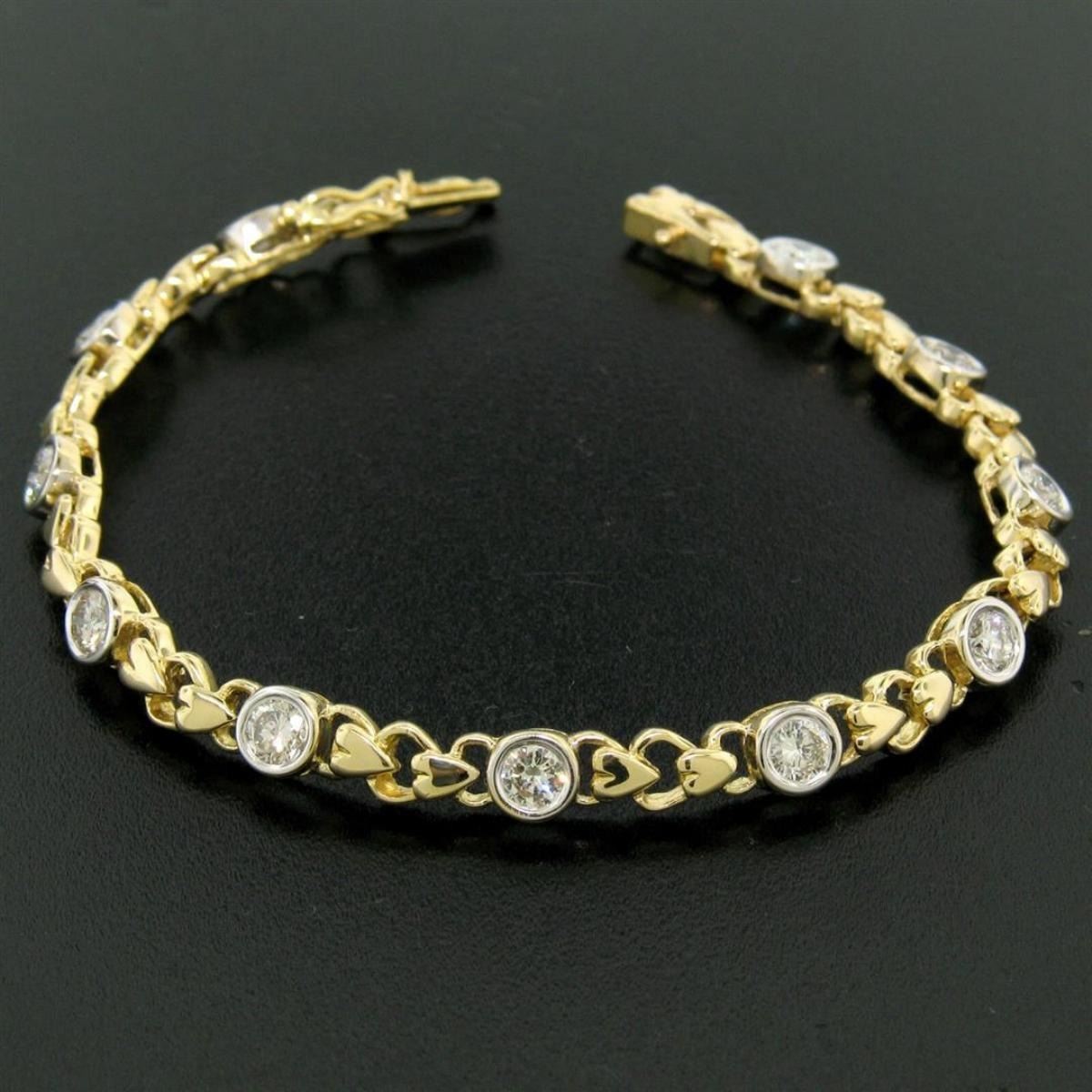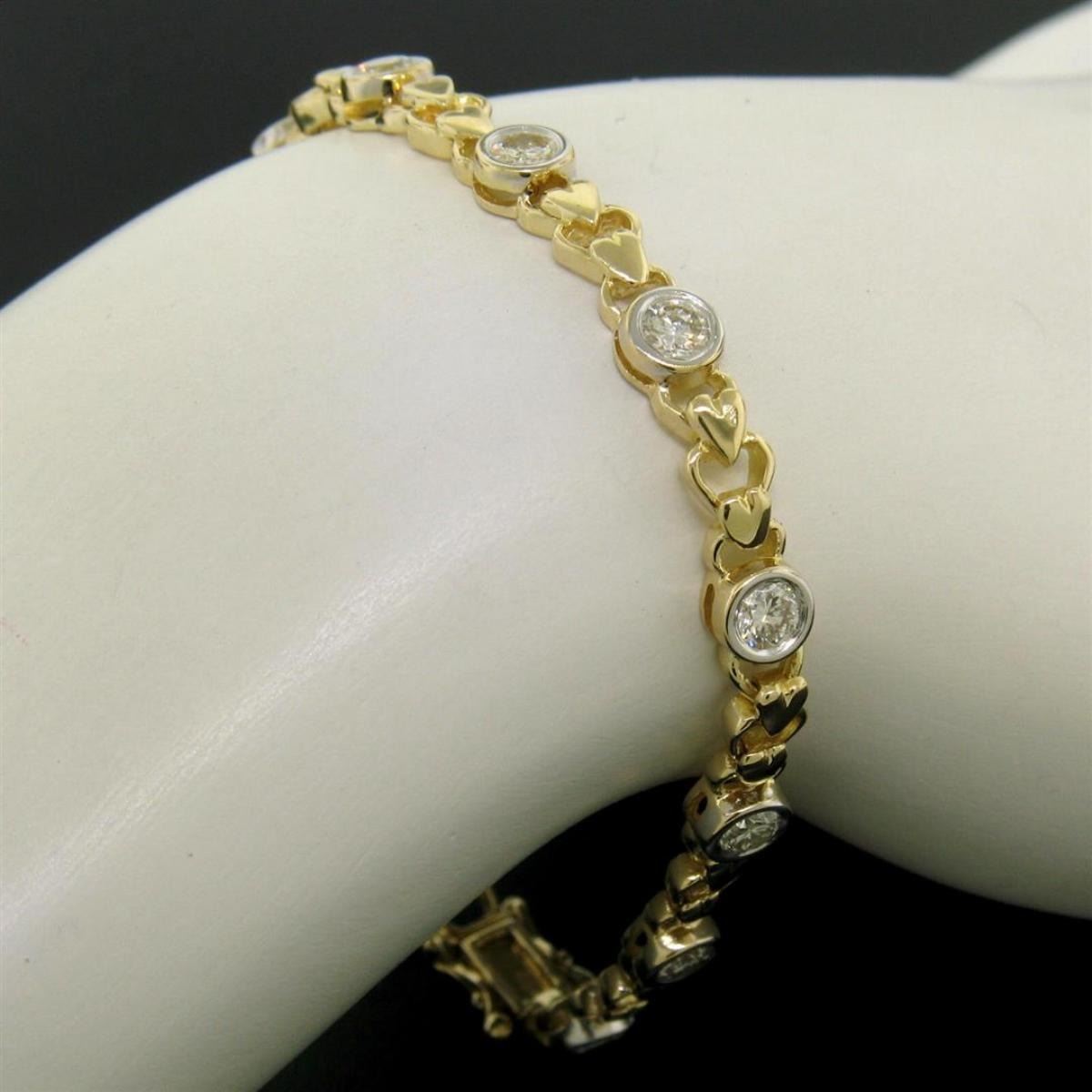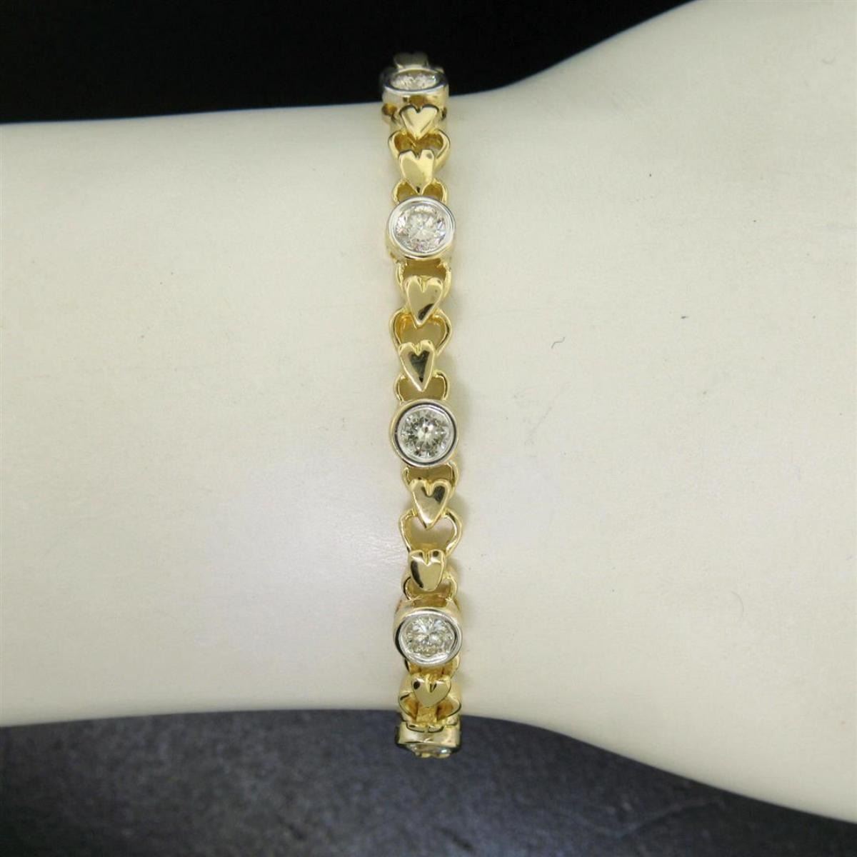 One 18k Yellow Gold 2.15ctw Round Brilliant Diamond Open Heart Link Tennis Bracelet. Item Details: Material: 18k Solid Yellow Gold, Weight: 10.60 Grams, Stone(s): (11) Natural Genuine Diamonds - Round Brilliant Cut - Bezel Set - VS2 Clarity - H/I Color, Total Carat Weight: 2.15 (approx.), Chain Type: Heart Solid & Open Link, Chain Length: 6.25 Inches, Clasp: Push Clasp w/ Dual Safety Latches, Width: 4.90mm Thickness: 3.20mm Condition: Like New!