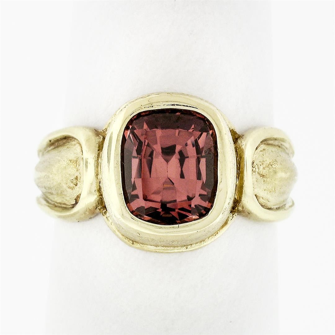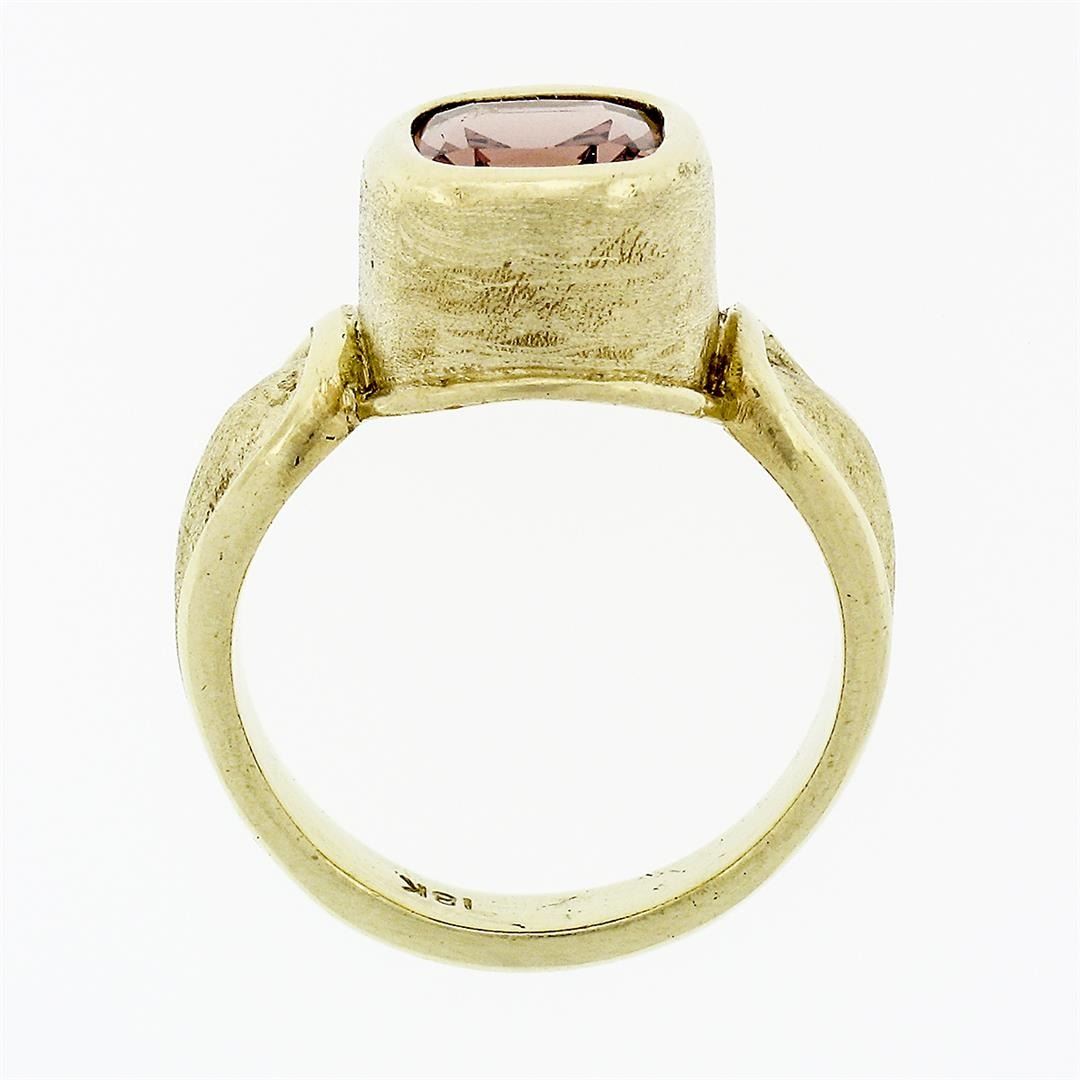 A solid 18k yellow gold solitaire ring, with 1 cushion cut natural morganite (8.50x7.02mm ; 2.38ct). The ring is size 6.5, weighs a total of 9.82 grams, and measures 12.14mm wide.