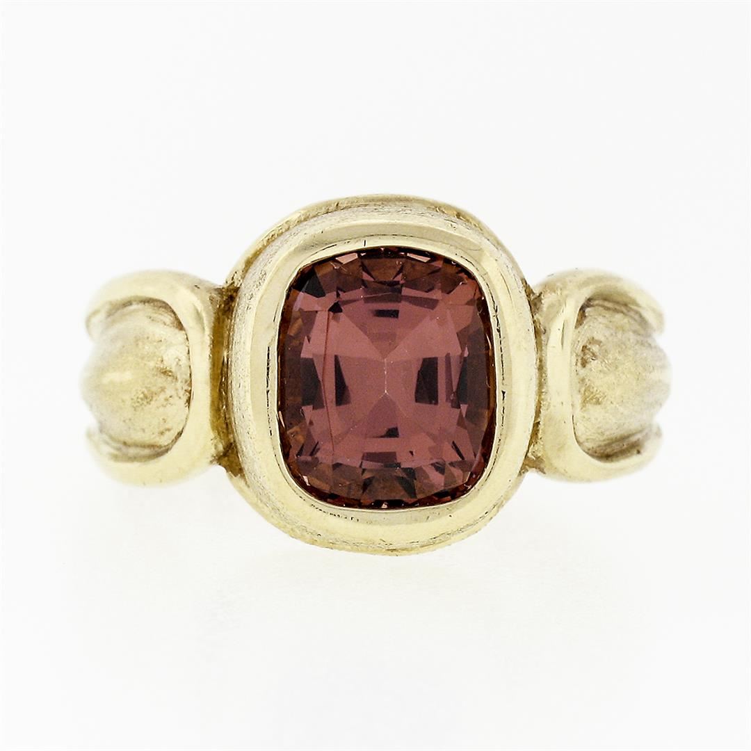 A solid 18k yellow gold solitaire ring, with 1 cushion cut natural morganite (8.50x7.02mm ; 2.38ct). The ring is size 6.5, weighs a total of 9.82 grams, and measures 12.14mm wide.