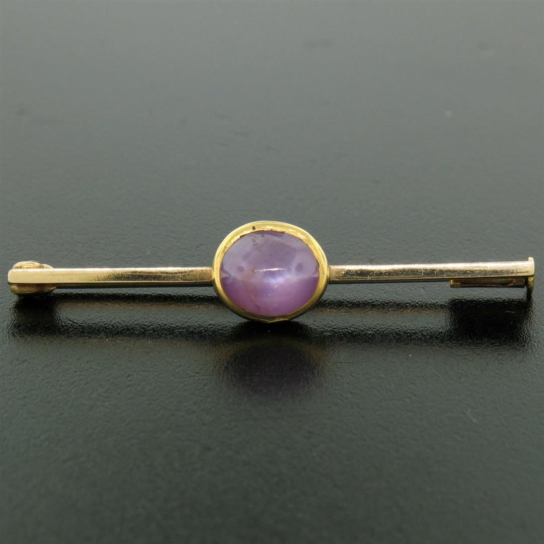 One Vintage 18k Yellow Gold 2.50ct Oval Bezel Set Pink Star Sapphire Bar Pin Brooch. Item Details: Material: 18k Solid Yellow Gold, Total Weight: 3.6 Grams, Stone(s): (1) Natural Genuine Star Sapphire - Oval Cabochon Cut - Bezel Set - Deep Pink to Lavender Color - 8.10x6.80mm / 2.50ct (approx.), Closure: Pin Back w/ Slide Barrel Lock, Overall Height: 8.24mm, Overall Width: 42.80mm, Overall Thickness: 6.70mm, Condition: Vintage piece. Excellent condition!