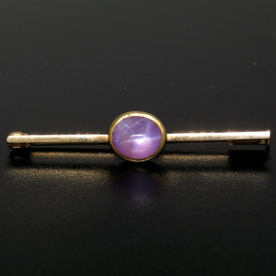 One Vintage 18k Yellow Gold 2.50ct Oval Bezel Set Pink Star Sapphire Bar Pin Brooch. Item Details: Material: 18k Solid Yellow Gold, Total Weight: 3.6 Grams, Stone(s): (1) Natural Genuine Star Sapphire - Oval Cabochon Cut - Bezel Set - Deep Pink to Lavender Color - 8.10x6.80mm / 2.50ct (approx.), Closure: Pin Back w/ Slide Barrel Lock, Overall Height: 8.24mm, Overall Width: 42.80mm, Overall Thickness: 6.70mm, Condition: Vintage piece. Excellent condition!