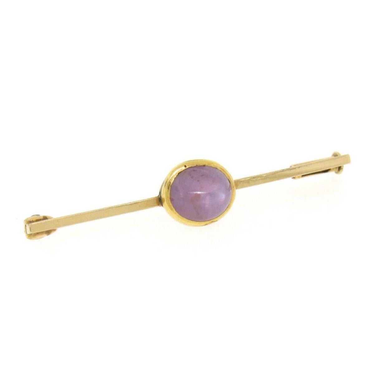 One Vintage 18k Yellow Gold 2.50 ct Oval Bezel Set Pink Star Sapphire Bar Pin Brooch. Item Details: Material: 18k Solid Yellow Gold, Total Weight: 3.6 Grams, Stone(s): (1) Natural Genuine Star Sapphire - Oval Cabochon Cut - Bezel Set - Deep Pink to Lavender Color - 8.10x6.80mm / 2.50 ct (approx.), Closure: Pin Back w/ Slide Barrel Lock, Overall Height: 8.24mm, Overall Width: 42.80mm, Overall Thickness: 6.70mm, Condition: Vintage piece. Excellent condition!