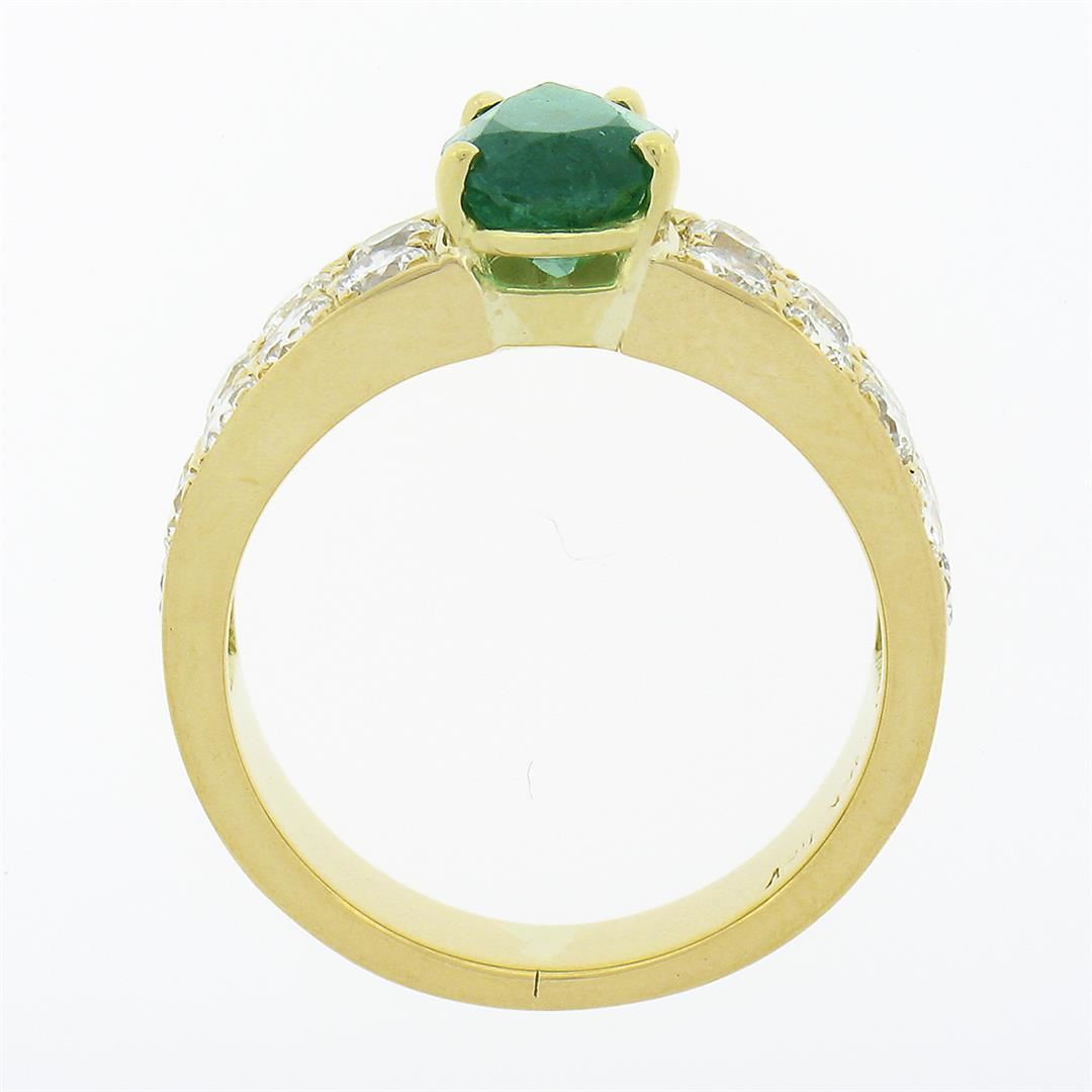 A solid 18k yellow gold engagement ring, with 1 pead cut natural emerald (9.1x6.35mm - 1.80ct), and 18 round brilliant cut natural diamonds (H/I - VS2/SI1 ; 1.26ctw). The ring is size 7.5, weighs a total of 8.0 grams, and measures 9.85mm wide.