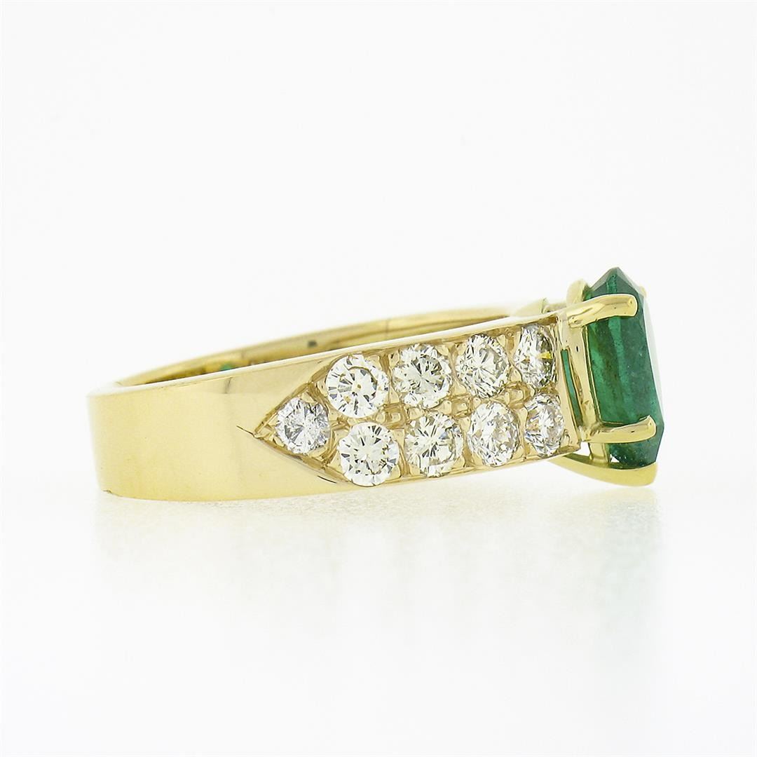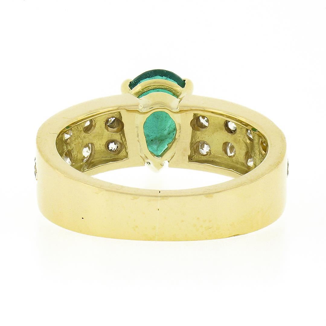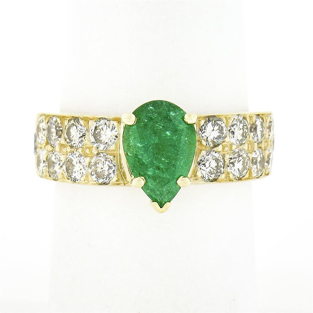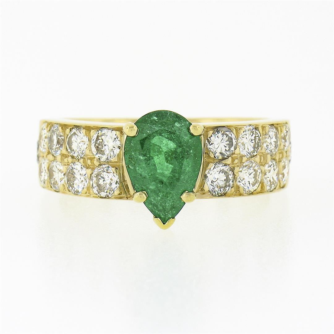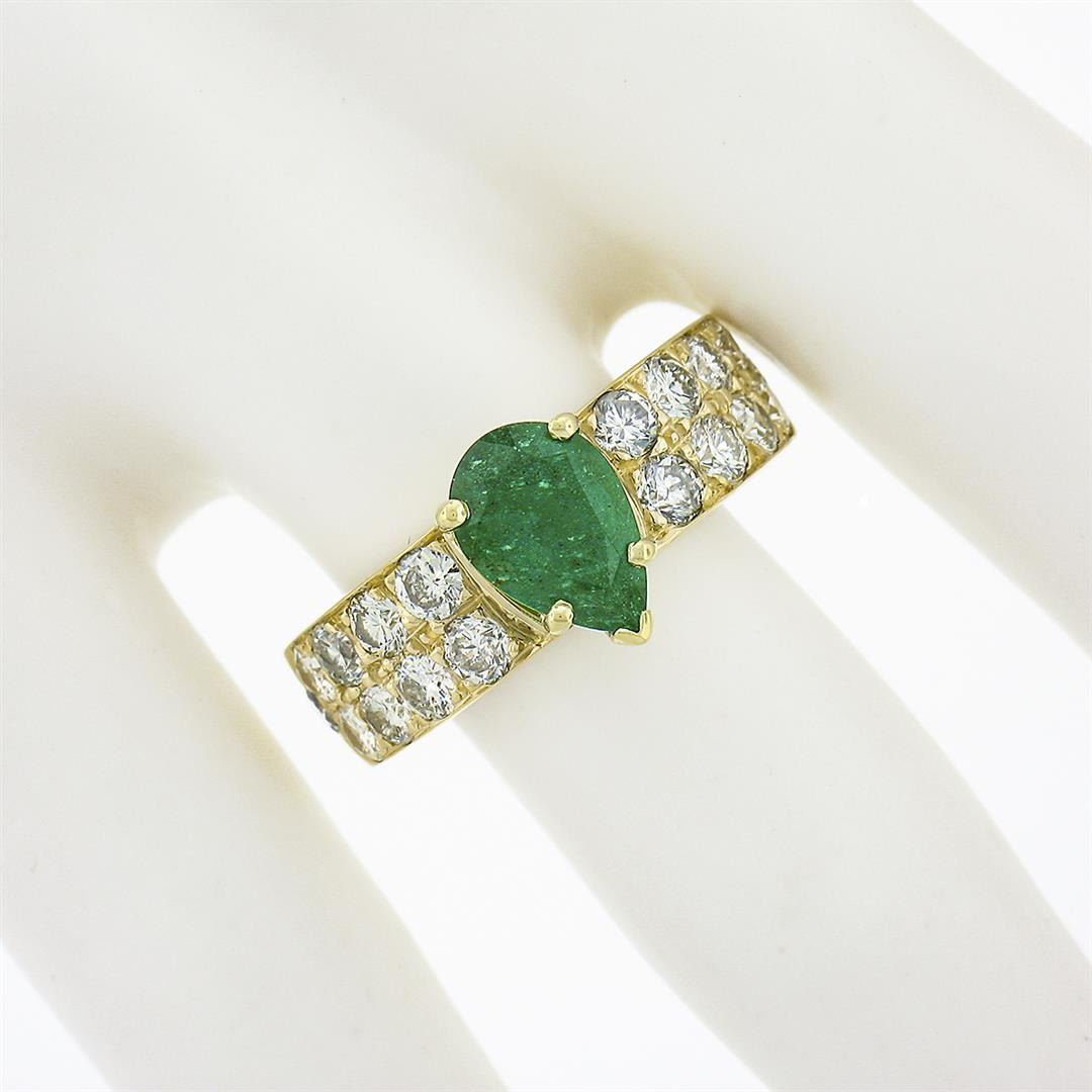 A solid 18k yellow gold engagement ring, with 1 pead cut natural emerald (9.1x6.35mm - 1.80ct), and 18 round brilliant cut natural diamonds (H/I - VS2/SI1 ; 1.26ctw). The ring is size 7.5, weighs a total of 8.0 grams, and measures 9.85mm wide.