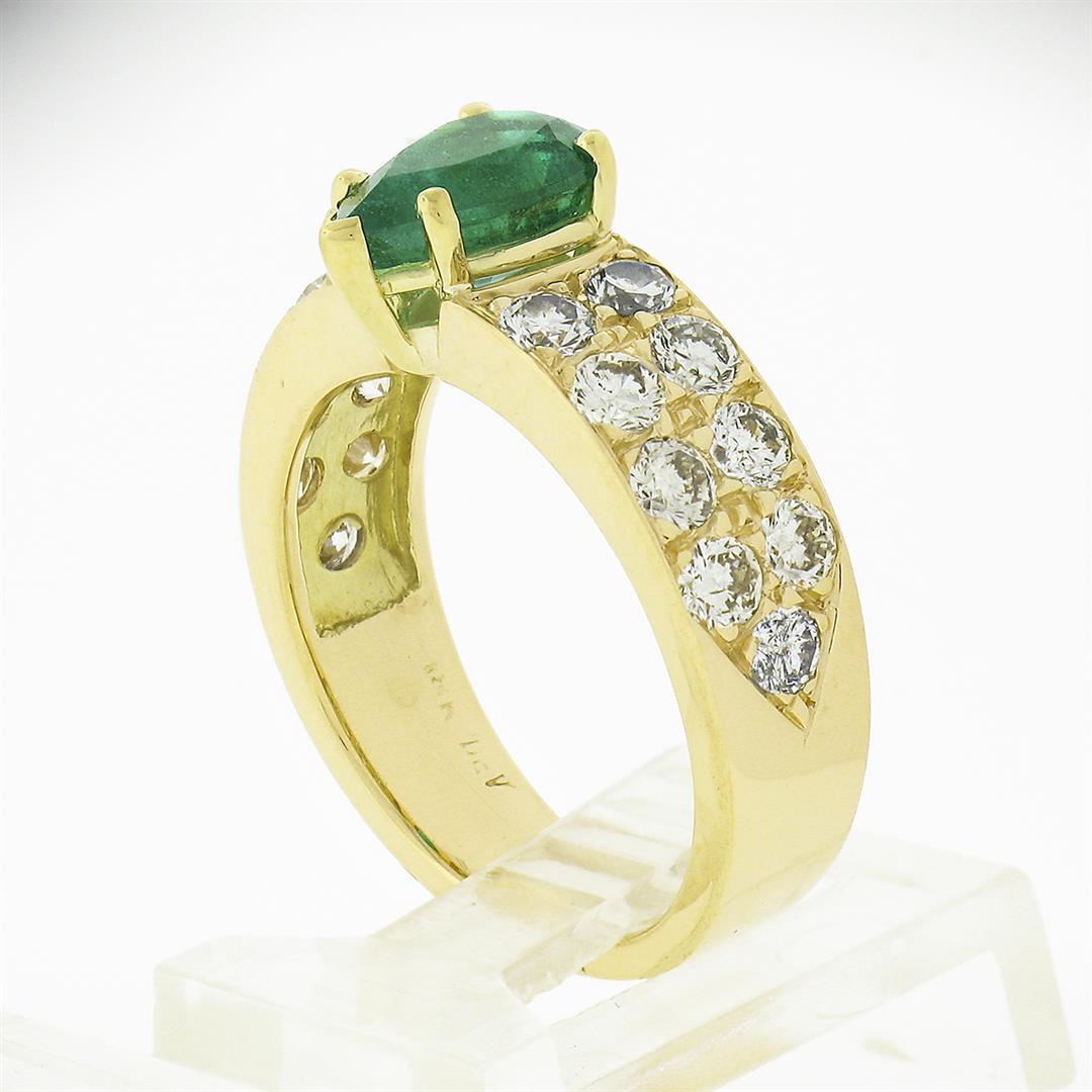 A solid 18k yellow gold engagement ring, with 1 pead cut natural emerald (9.1x6.35mm - 1.80ct), and 18 round brilliant cut natural diamonds (H/I - VS2/SI1 ; 1.26ctw). The ring is size 7.5, weighs a total of 8.0 grams, and measures 9.85mm wide.