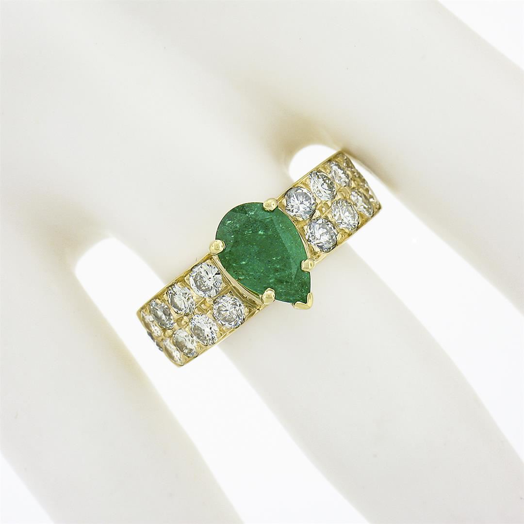 A solid 18k yellow gold engagement ring, with 1 pead cut natural emerald (9.1x6.35mm - 1.80ct), and 18 round brilliant cut natural diamonds (H/I  - VS2/SI1 ; 1.26ctw). The ring is size 7.5, weighs a total of 8.0  grams, and measures 9.85mm wide.