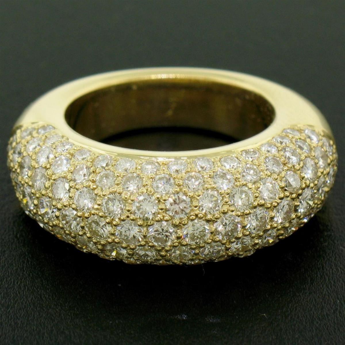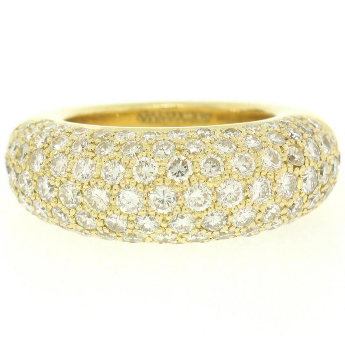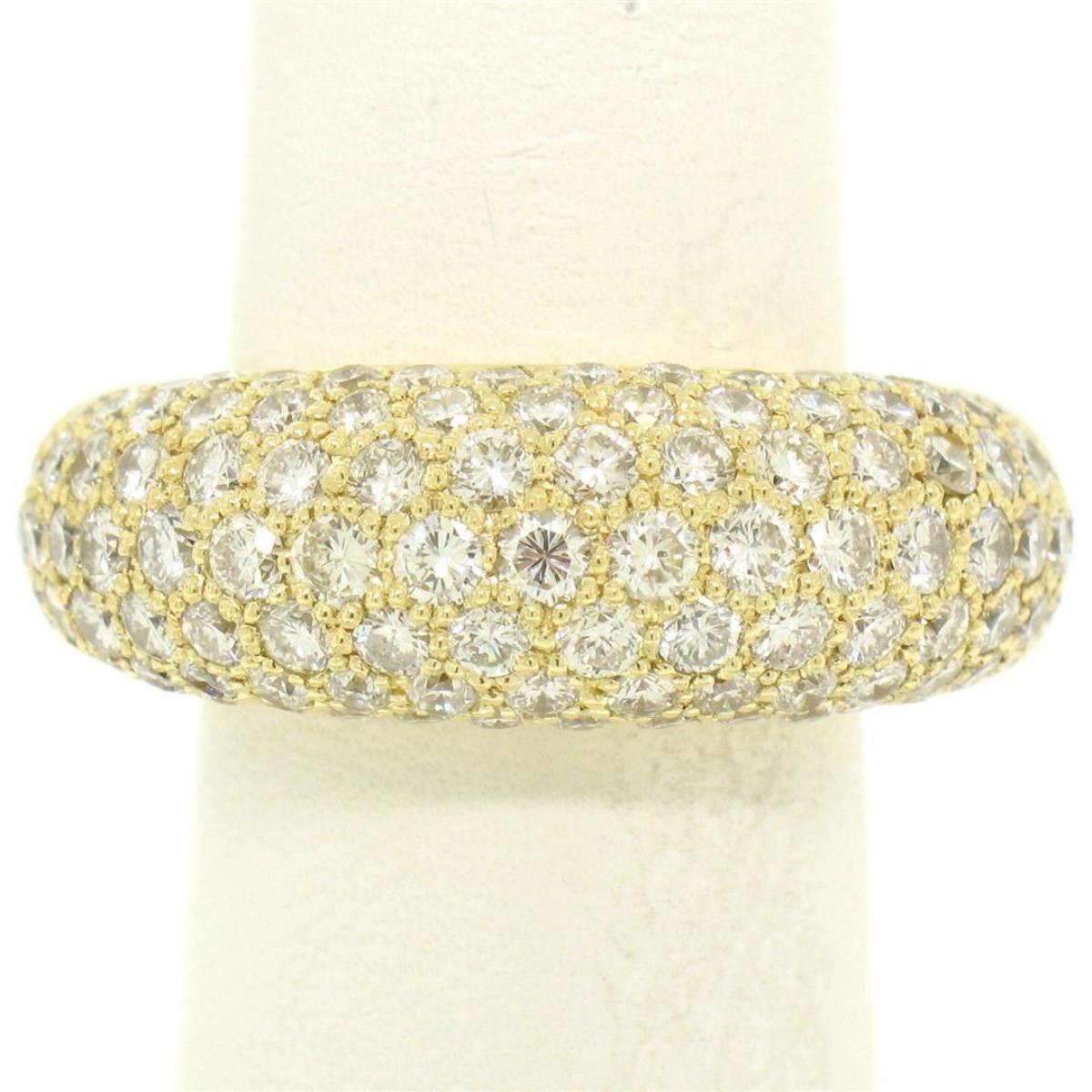 One 18k Yellow Gold 4.46ctw F VS Pave Set Round Brilliant Cut Diamond Dome Band Ring. Item Details: Material: Solid 18k Yellow Gold, Weight: 11.2 Grams, Stone(s): (107) Natural Genuine Diamonds - Round Brilliant Cut - Pav� Set - F/G Color - VS1/VS2 Clarity, Total Carat Weight: 4.46 (approx.), Ring Size: 7.0 (We can custom size this ring, Please message about sizing before purchase), Ring Width: 9.32mm, Ring Height: 6.73mm rise off the finger, Condition: Excellent condition!