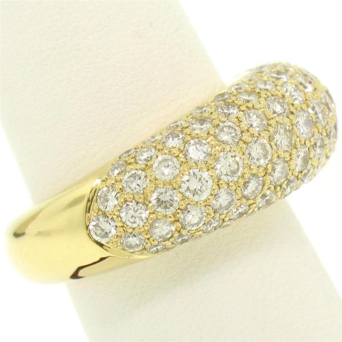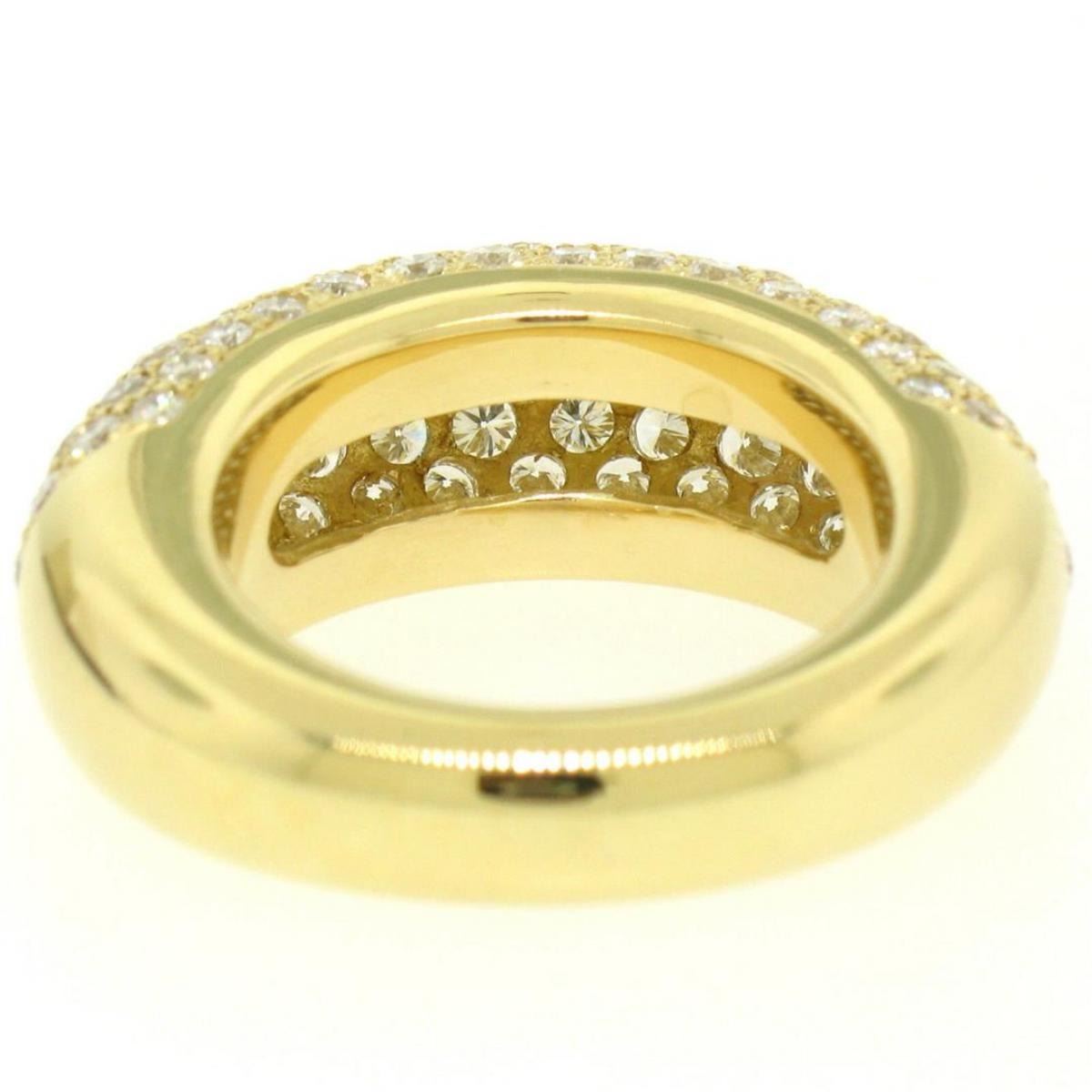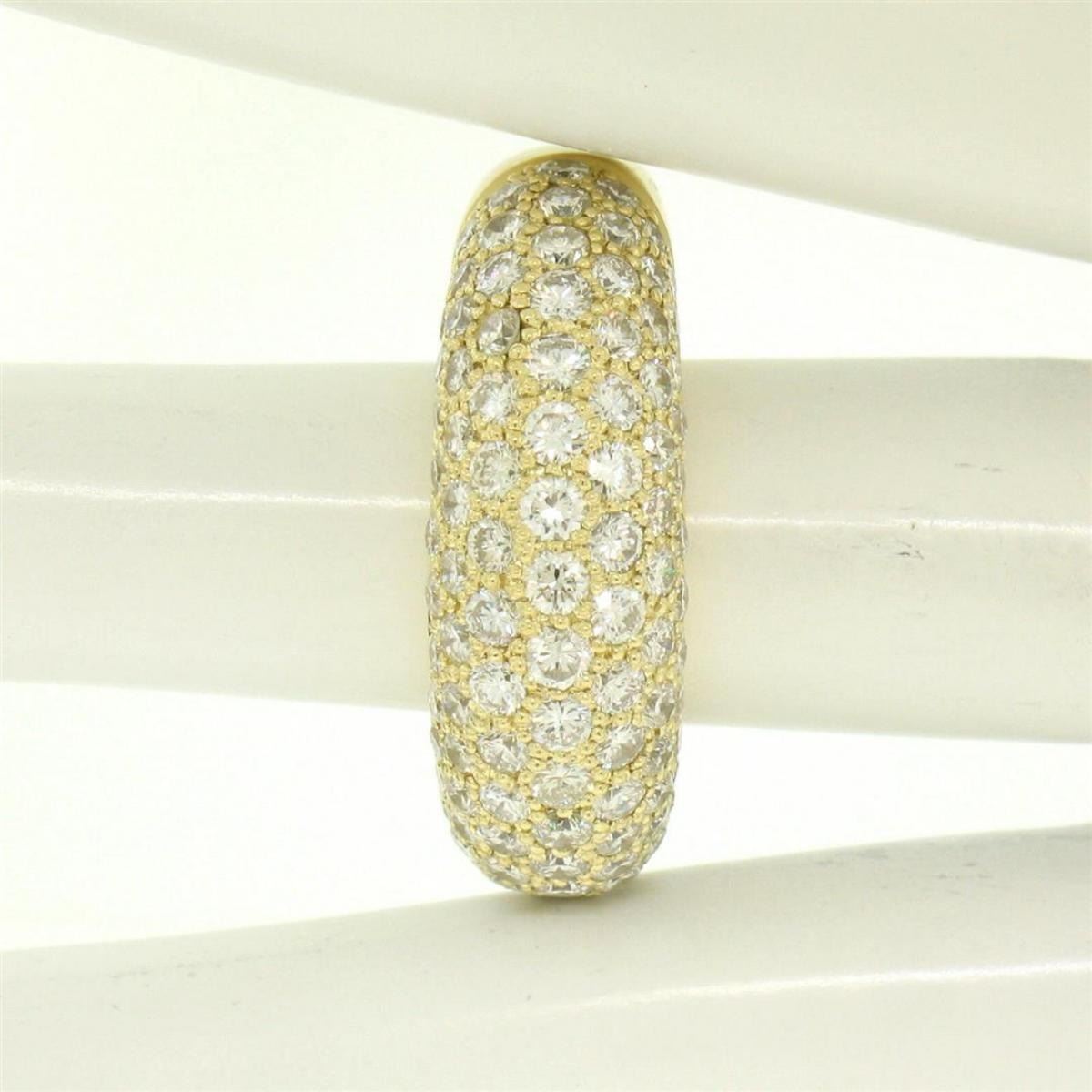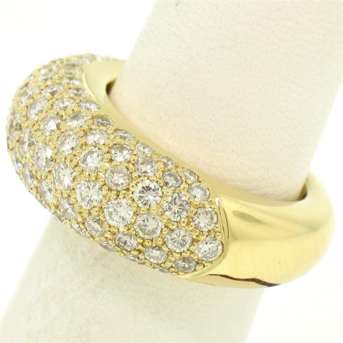 One 18k Yellow Gold 4.46ctw F VS Pave Set Round Brilliant Cut Diamond Dome Band Ring. Item Details: Material: Solid 18k Yellow Gold, Weight: 11.2 Grams, Stone(s): (107) Natural Genuine Diamonds - Round Brilliant Cut - Pav� Set - F/G Color - VS1/VS2 Clarity, Total Carat Weight: 4.46 (approx.), Ring Size: 7.0 (We can custom size this ring, Please message about sizing before purchase), Ring Width: 9.32mm, Ring Height: 6.73mm rise off the finger, Condition: Excellent condition!