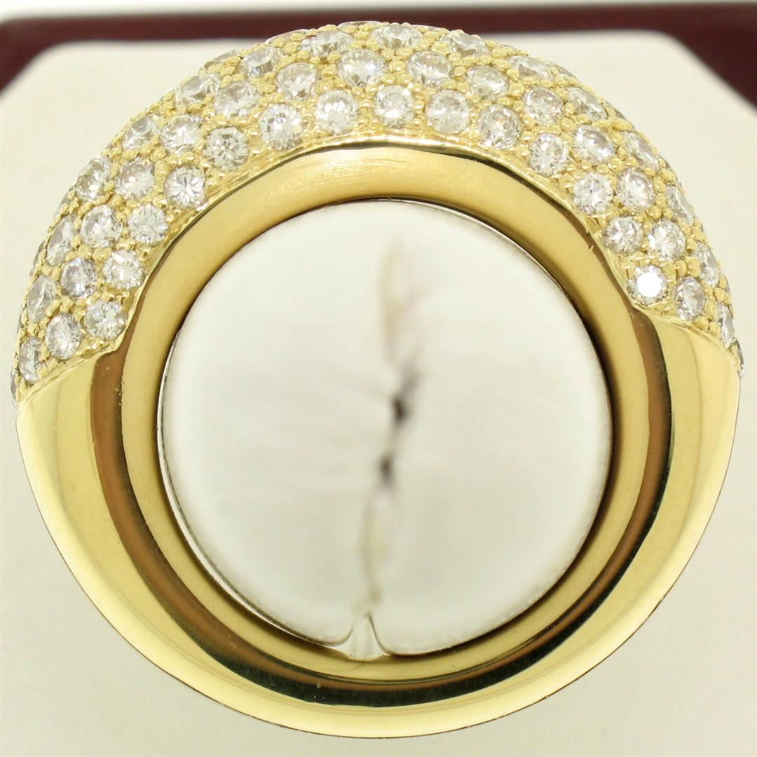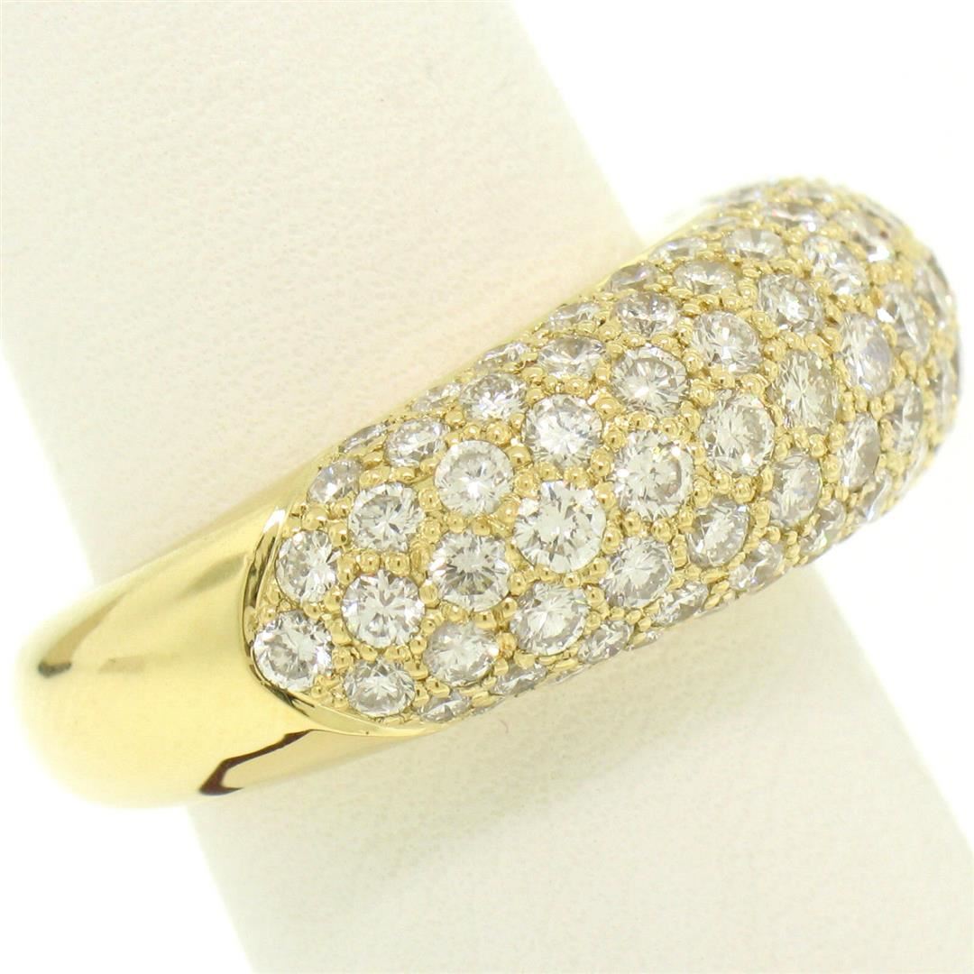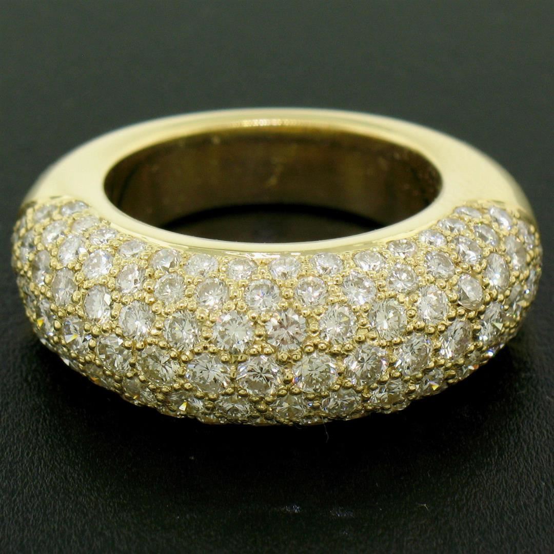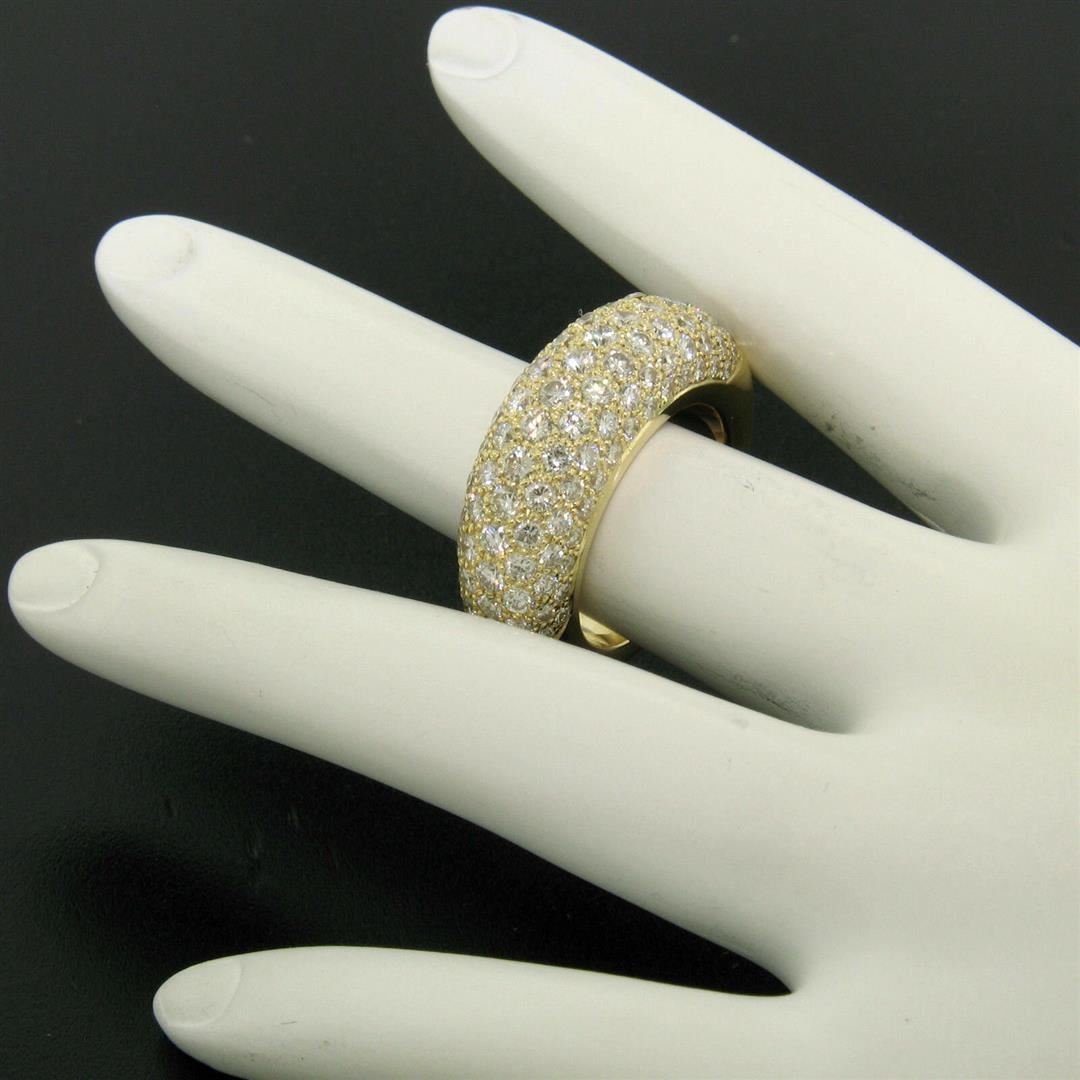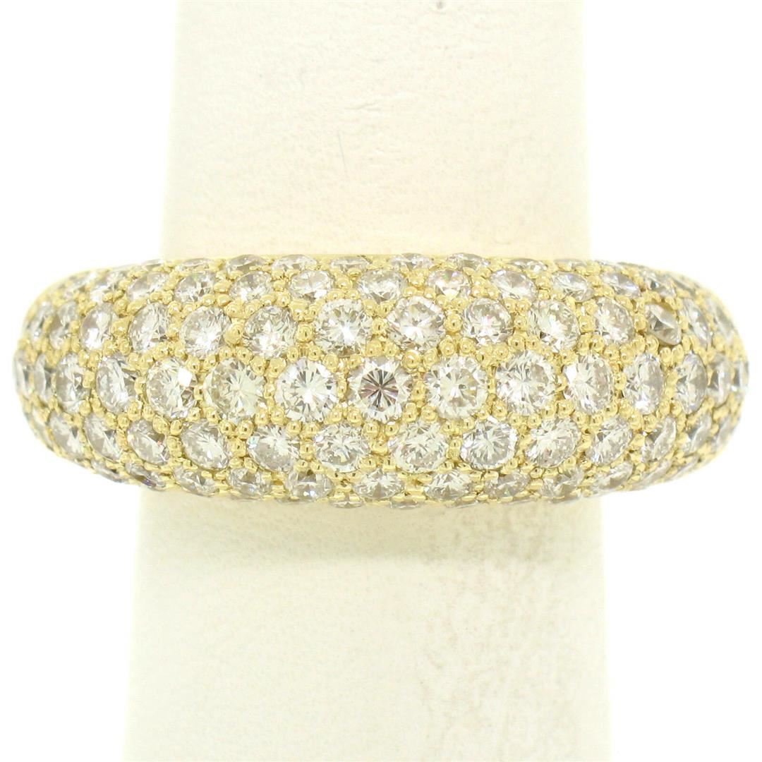One 18k Yellow Gold 4.46ctw F VS Pave Set Round Brilliant Cut Diamond Dome Band Ring. Item Details: Material: Solid 18k Yellow Gold, Weight: 11.2 Grams, Stone(s): (107) Natural Genuine Diamonds - Round Brilliant Cut - Pav� Set - F/G Color - VS1/VS2 Clarity, Total Carat Weight: 4.46 (approx.), Ring Size: 7.0 (We can custom size this ring, Please message about sizing before purchase), Ring Width: 9.32mm, Ring Height: 6.73mm rise off the finger, Condition: Excellent condition!