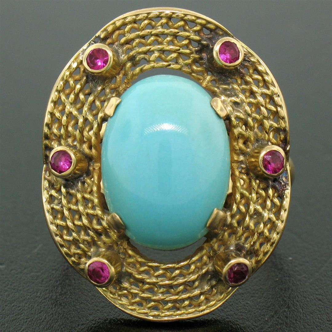One Vintage Hand Made 18k Yellow Gold 5.3ctw Persian Turquoise & Ruby Wavy Halo Ring. Item Details - Material: 18k Solid Yellow Gold, Weight: 8.6 Grams, Stone(s): (1) Natural Genuine Persian Turquoise - Oval Cabochon Cut - Prong Set - Gorgeous Turquoise Color - 5.12ct (exact), (6) Natural Genuine Rubies - Round Cut - Bezel Set - Rich Red Color - 0.18ctw (approx.), Total Carat Weight: 5.30 (approx.), Ring Size: 7.5, Ring Width: 26.0mm, Ring Height: 8.62mm rise off the finger, Condition: Vintage piece. Original patina preserved. Excellent condition!