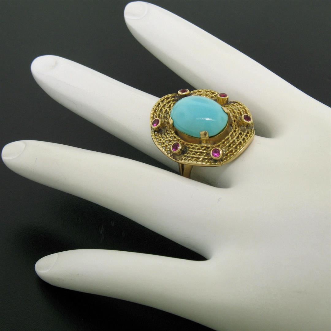 One Vintage Hand Made 18k Yellow Gold 5.3ctw Persian Turquoise & Ruby Wavy Halo Ring. Item Details - Material: 18k Solid Yellow Gold, Weight: 8.6 Grams, Stone(s): (1) Natural Genuine Persian Turquoise - Oval Cabochon Cut - Prong Set - Gorgeous Turquoise Color - 5.12ct (exact), (6) Natural Genuine Rubies - Round Cut - Bezel Set - Rich Red Color - 0.18ctw (approx.), Total Carat Weight: 5.30 (approx.), Ring Size: 7.5, Ring Width: 26.0mm, Ring Height: 8.62mm rise off the finger, Condition: Vintage piece. Original patina preserved. Excellent condition!