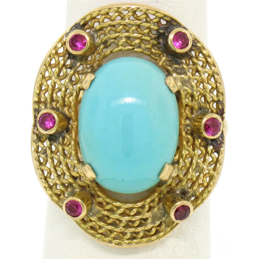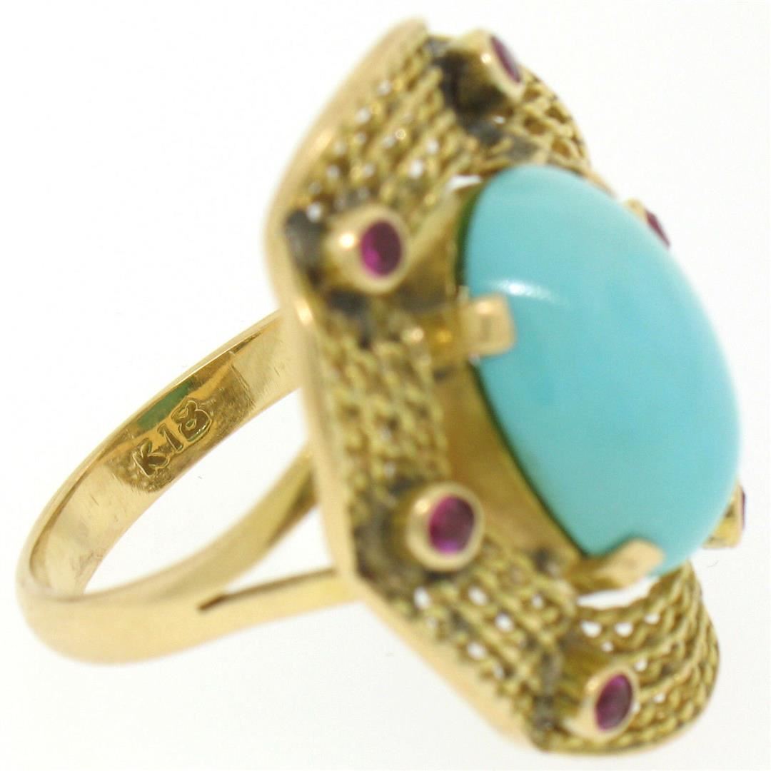 One Vintage Hand Made 18k Yellow Gold 5.3ctw Persian Turquoise & Ruby Wavy Halo Ring. Item Details - Material: 18k Solid Yellow Gold, Weight: 8.6 Grams, Stone(s): (1) Natural Genuine Persian Turquoise - Oval Cabochon Cut - Prong Set - Gorgeous Turquoise Color - 5.12ct (exact), (6) Natural Genuine Rubies - Round Cut - Bezel Set - Rich Red Color - 0.18ctw (approx.), Total Carat Weight: 5.30 (approx.), Ring Size: 7.5, Ring Width: 26.0mm, Ring Height: 8.62mm rise off the finger, Condition: Vintage piece. Original patina preserved. Excellent condition!