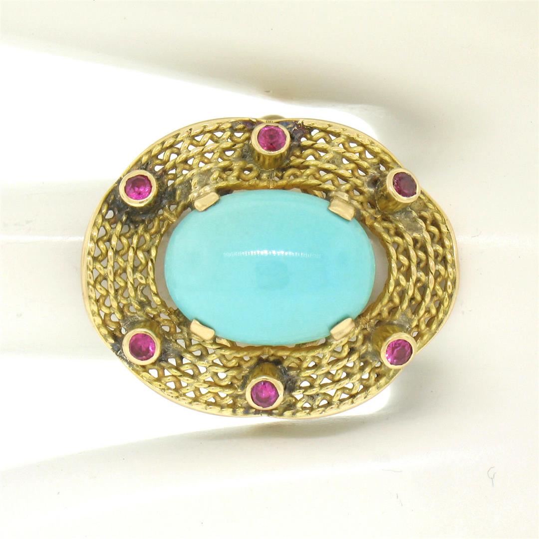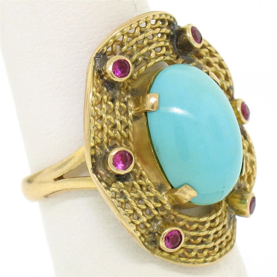 One Vintage Hand Made 18k Yellow Gold 5.3ctw Persian Turquoise & Ruby Wavy Halo Ring. Item Details - Material: 18k Solid Yellow Gold, Weight: 8.6 Grams, Stone(s): (1) Natural Genuine Persian Turquoise - Oval Cabochon Cut - Prong Set - Gorgeous Turquoise Color - 5.12ct (exact), (6) Natural Genuine Rubies - Round Cut - Bezel Set - Rich Red Color - 0.18ctw (approx.), Total Carat Weight: 5.30 (approx.), Ring Size: 7.5, Ring Width: 26.0mm, Ring Height: 8.62mm rise off the finger, Condition: Vintage piece. Original patina preserved. Excellent condition!