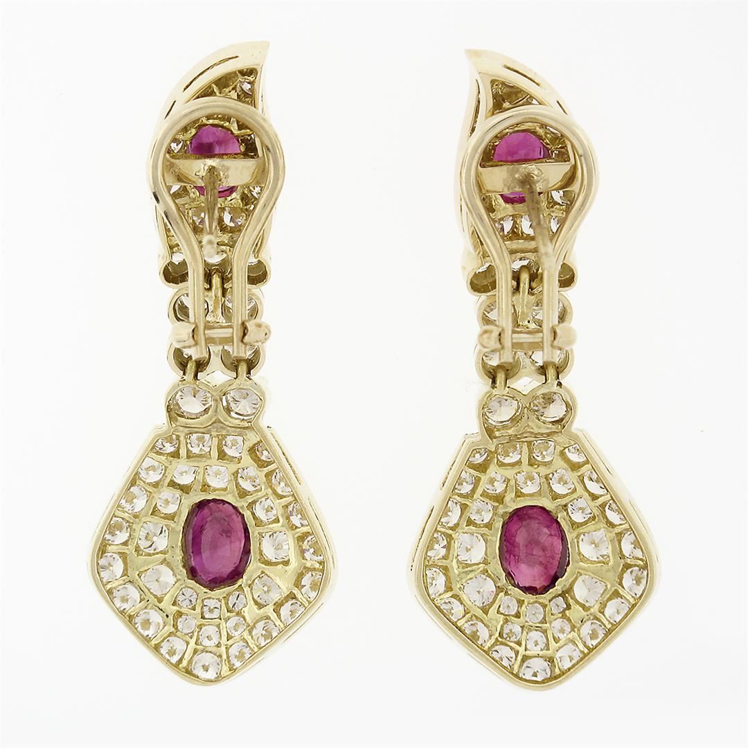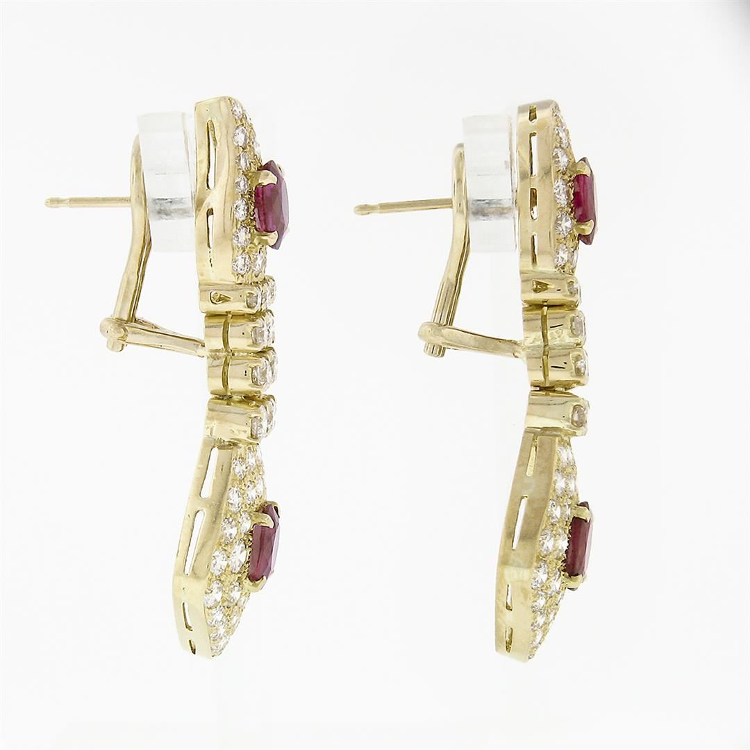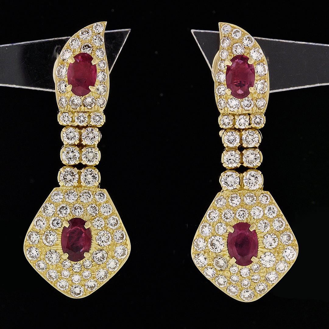 A solid 18k yellow gold dangel earrings, with 4 oval cut natural rubies (6.0x4.0mm - 2.50ctw), and 112 round brilliant cut natural diamonds (G/H- VS1/VS2; 3.26ctw). The earrings measure approximately 38.64x14.93mm and weigh a total of 11.21 grams.