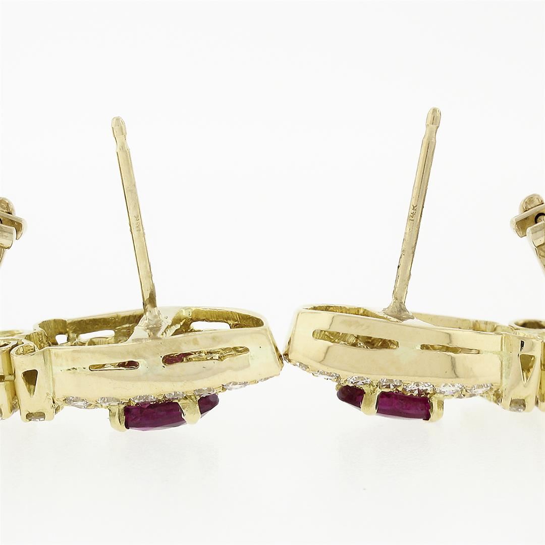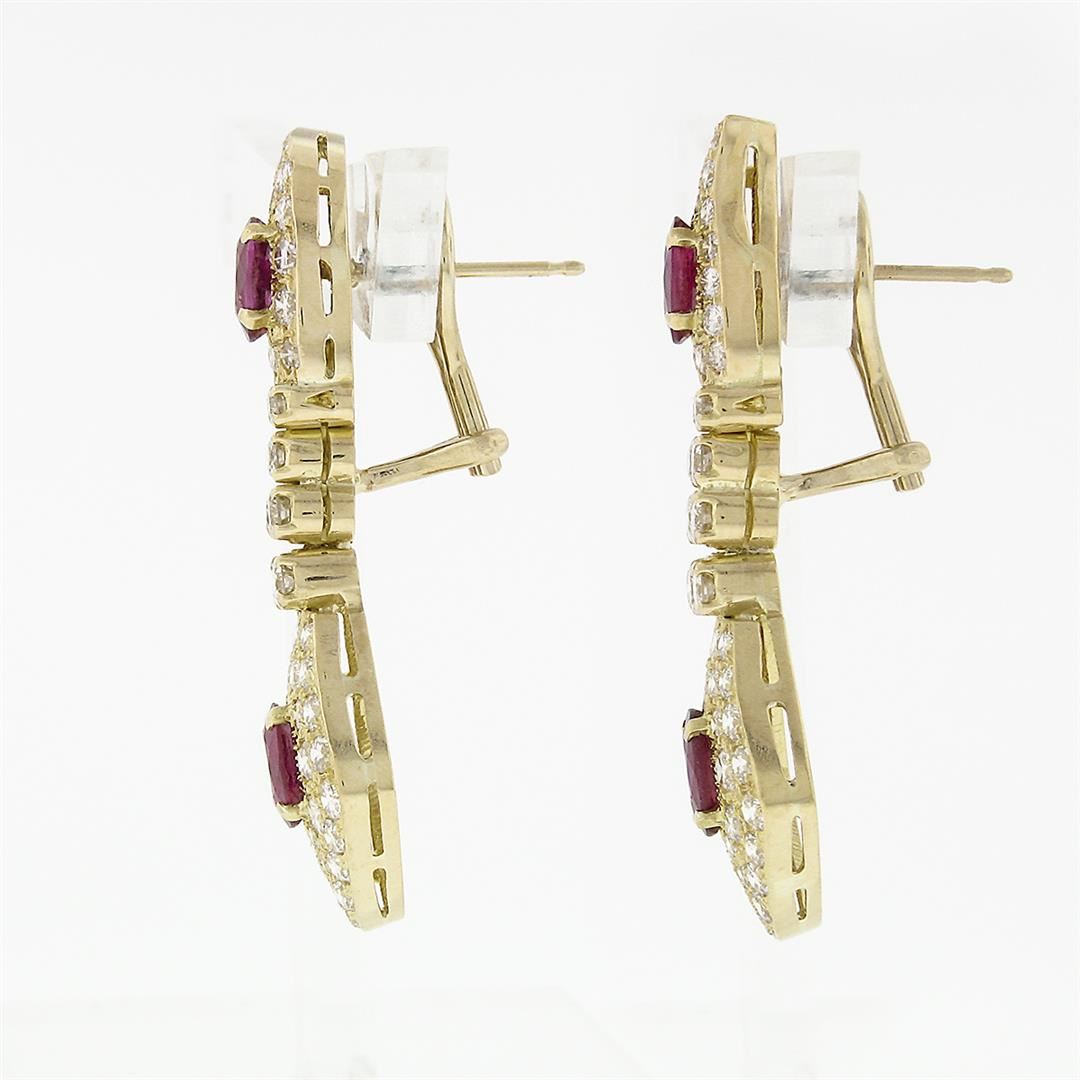 A solid 18k yellow gold dangel earrings, with 4 oval cut natural rubies (6.0x4.0mm - 2.50ctw), and 112 round brilliant cut natural diamonds (G/H- VS1/VS2; 3.26ctw). The earrings measure approximately 38.64x14.93mm and weigh a total of 11.21 grams.