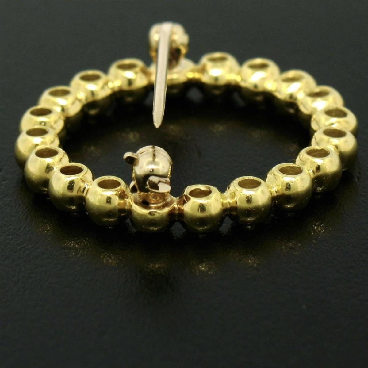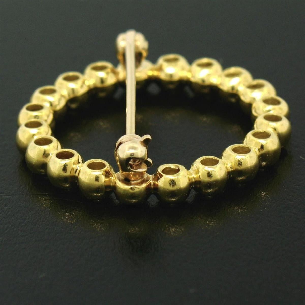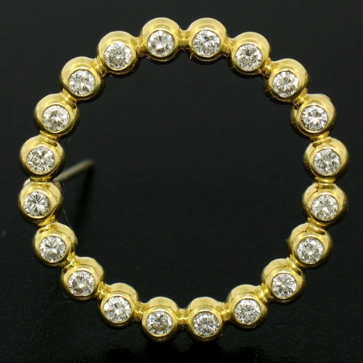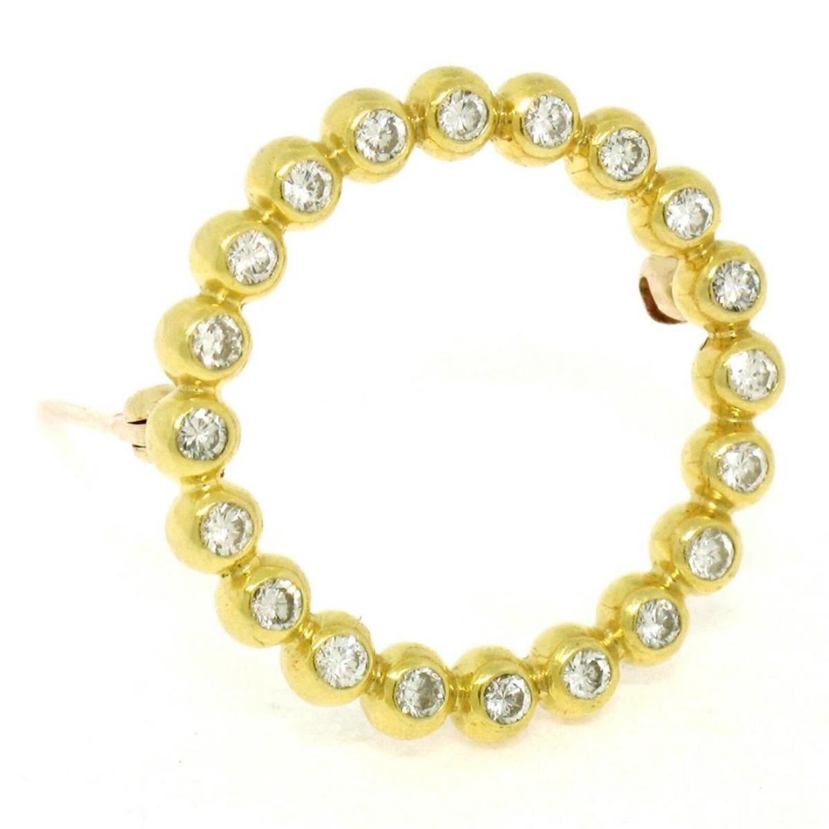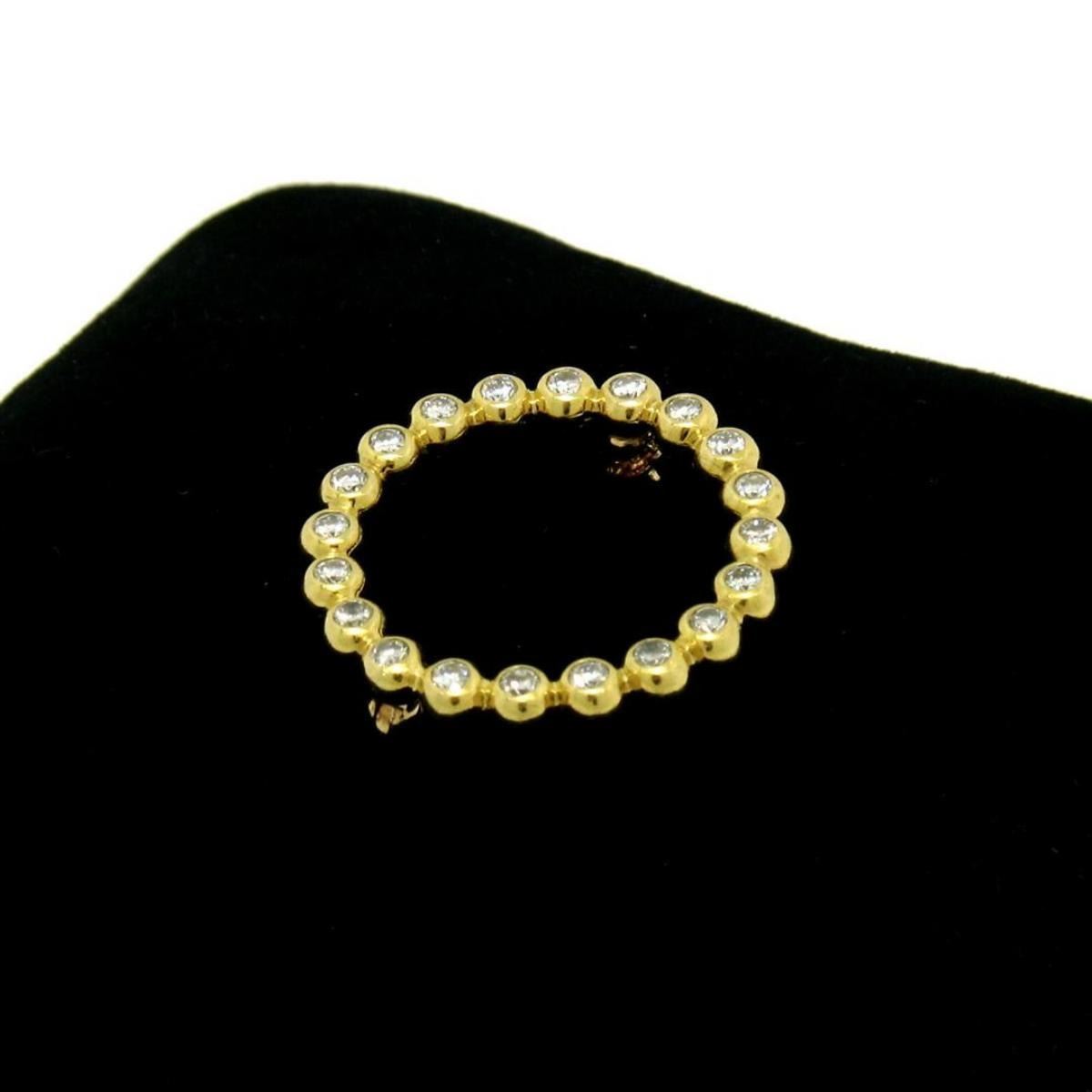 A solid 18k yellow gold circle of life brooch bezel set with 20 round brilliant cut natural diamonds (F/G - VS1; 0.60ctw). Measures 23.0mm in diameter and weighs a total of 4.25 grams.