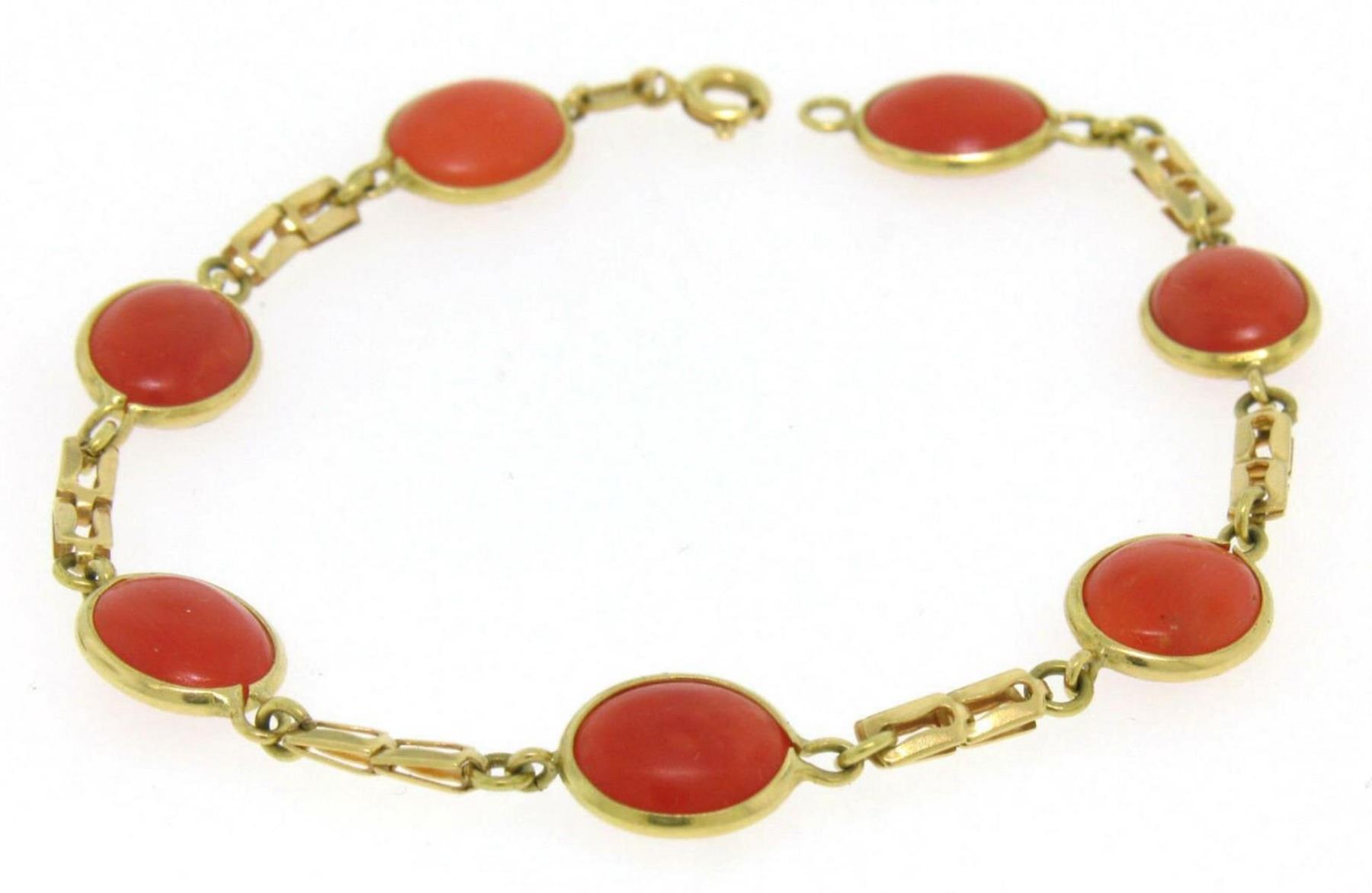 One Estate 18k Yellow Gold RARE 7 Matched Bezel Set Oval Red Coral Link Bracelet. Item Details: Material: Solid 18k Yellow Gold, Weight: 6.10 Grams, Stone(s): (7) Natural Genuine Corals - Oval Cabochon Cut - Bezel Set - Matched and Very Fine Deep Red Color - 11x9mm (approx.), Length: 7 Inches, Clasp: Spring Ring, Width: 9.0mm, Condition: Excellent condition.