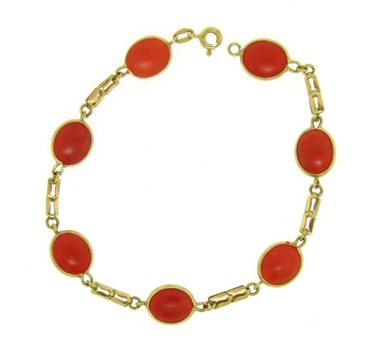 One Estate 18k Yellow Gold RARE 7 Matched Bezel Set Oval Red Coral Link Bracelet. Item Details: Material: Solid 18k Yellow Gold, Weight: 6.10 Grams, Stone(s): (7) Natural Genuine Corals - Oval Cabochon Cut - Bezel Set - Matched and Very Fine Deep Red Color - 11x9mm (approx.), Length: 7 Inches, Clasp: Spring Ring, Width: 9.0mm, Condition: Excellent condition.