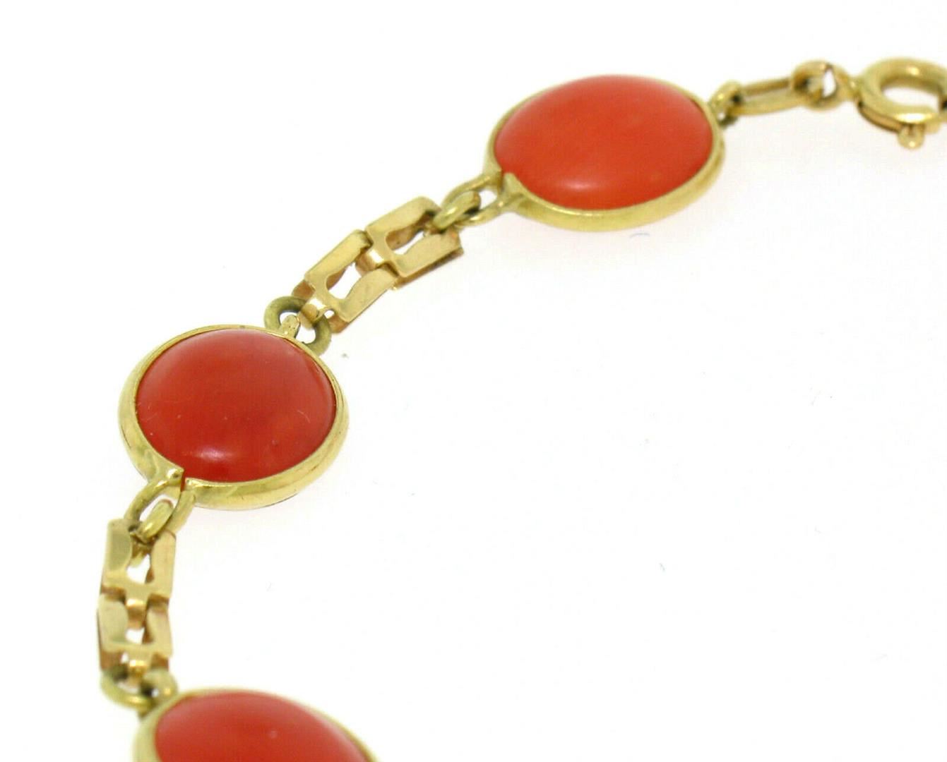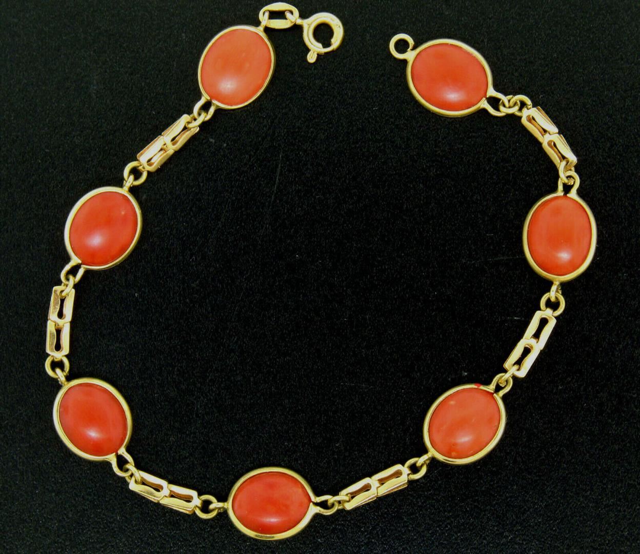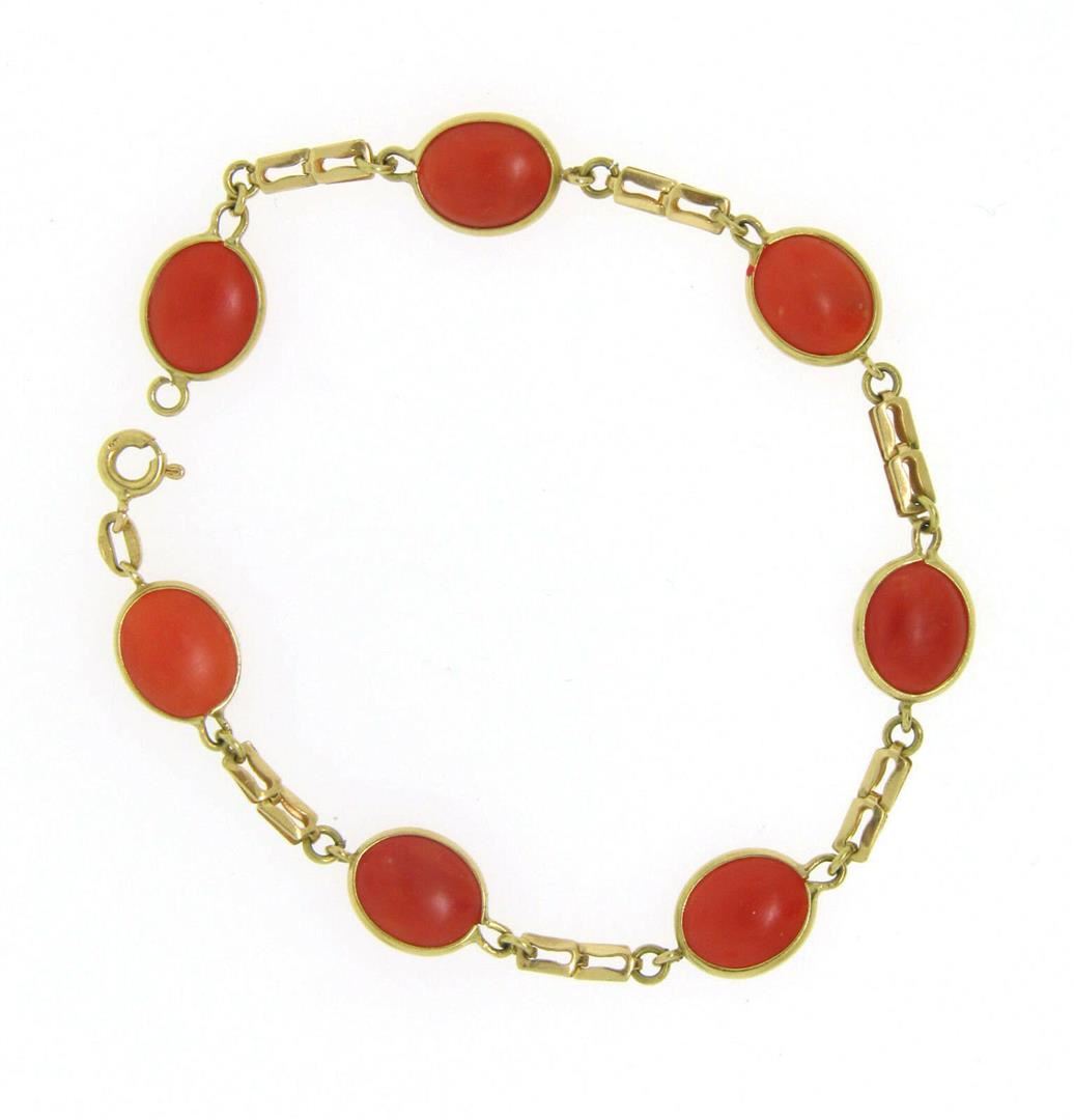 One Estate 18k Yellow Gold RARE 7 Matched Bezel Set Oval Red Coral Link Bracelet. Item Details: Material: Solid 18k Yellow Gold, Weight: 6.10 Grams, Stone(s): (7) Natural Genuine Corals - Oval Cabochon Cut - Bezel Set - Matched and Very Fine Deep Red Color - 11x9mm (approx.), Length: 7 Inches, Clasp: Spring Ring, Width: 9.0mm, Condition: Excellent condition.