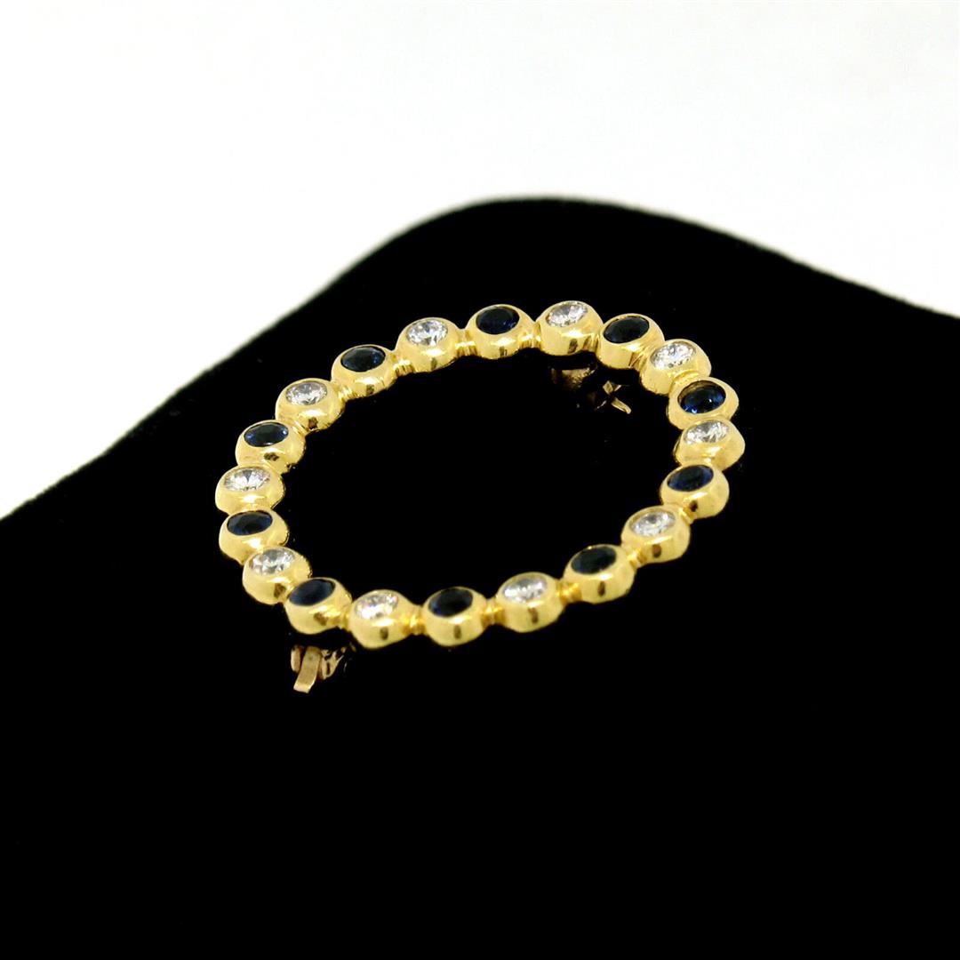 An estate solid 18k yellow gold wreath circle of life brooch, featuring 10 round cut natural sapphires (0.35ctw), alternated with 10 round brilliant cut natural diamonds (F/G - VS1/VS2 ; 0.35ctw). Measures 23.0mm in dimension and weighs a total of 4.18 grams.