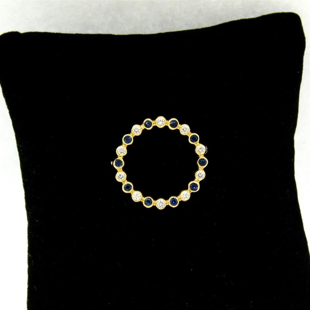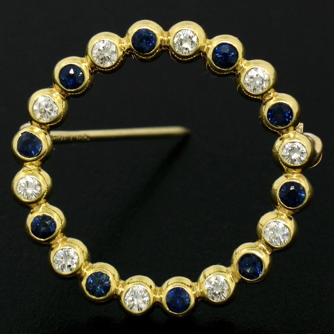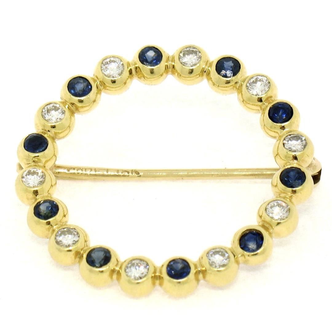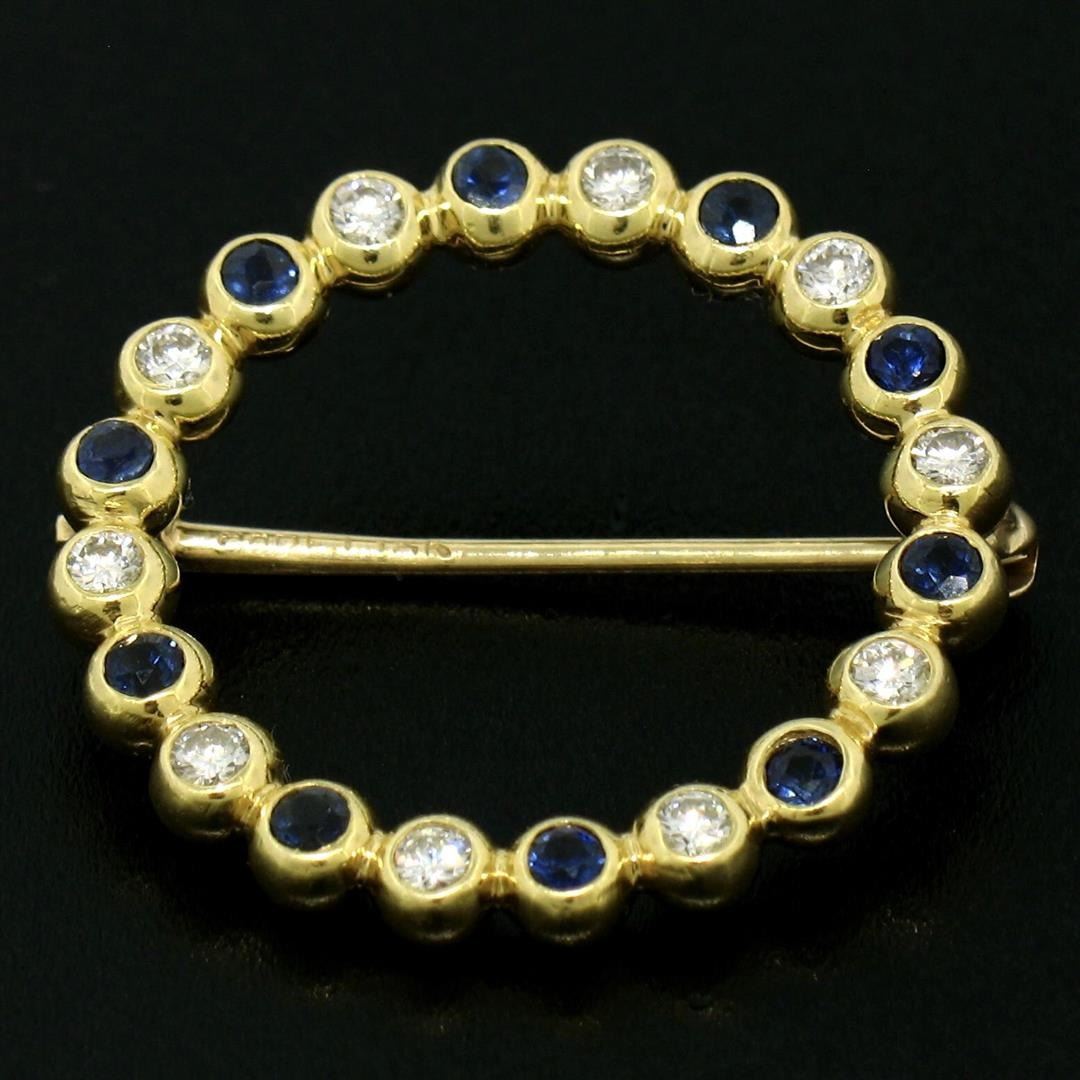 An estate solid 18k yellow gold wreath circle of life brooch, featuring 10 round cut natural sapphires (0.35ctw), alternated with 10 round brilliant cut natural diamonds (F/G - VS1/VS2 ; 0.35ctw). Measures 23.0mm in dimension and weighs a total of 4.18 grams.