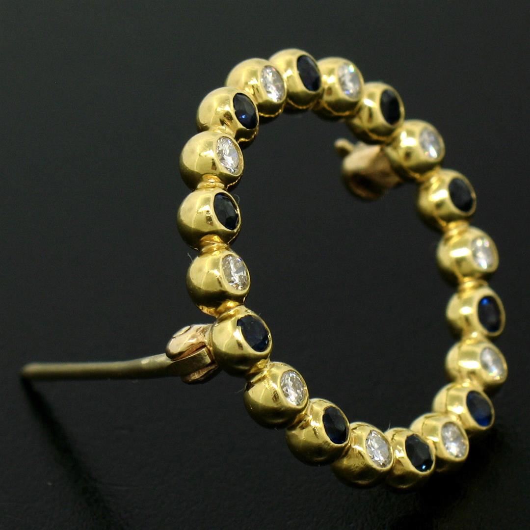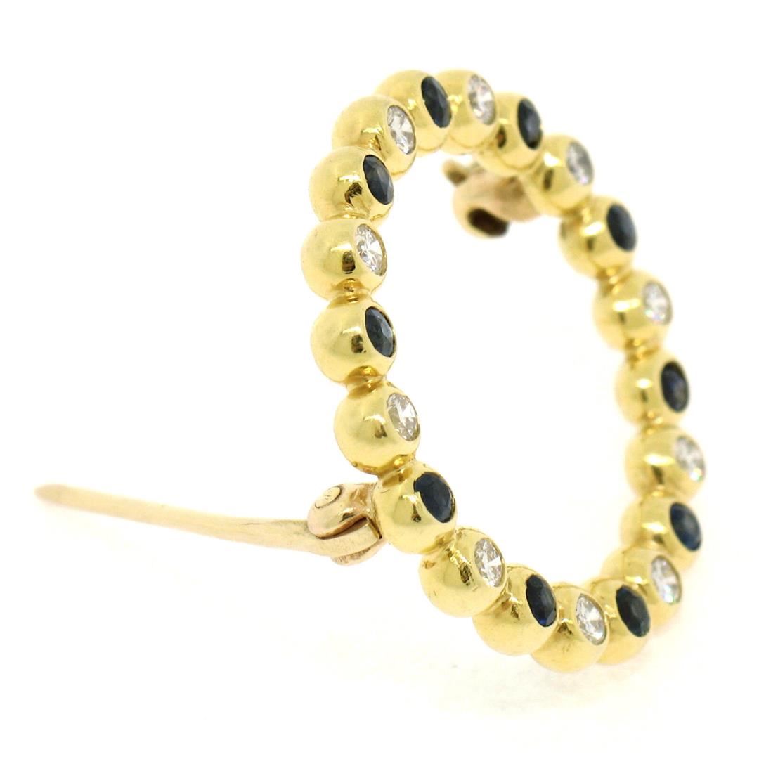 An estate solid 18k yellow gold wreath circle of life brooch, featuring 10 round cut natural sapphires (0.35ctw), alternated with 10 round brilliant cut natural diamonds (F/G - VS1/VS2 ; 0.35ctw). Measures 23.0mm in dimension and weighs a total of 4.18 grams.