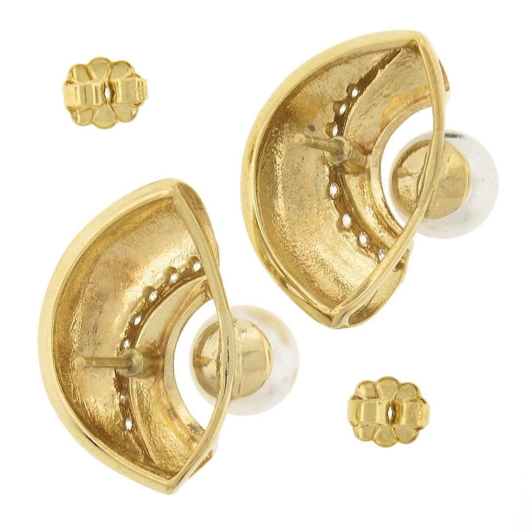 A solid 18k yellow gold half circle earrings, with 2 round shape cultured pearls (8mm each ), and 16 round brilliant cut cubic zirconia. The earrings measure approximately 22.3x18.1mm and weigh a total of 8.41 grams.