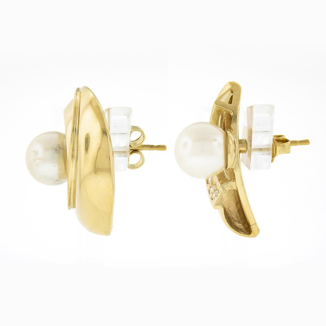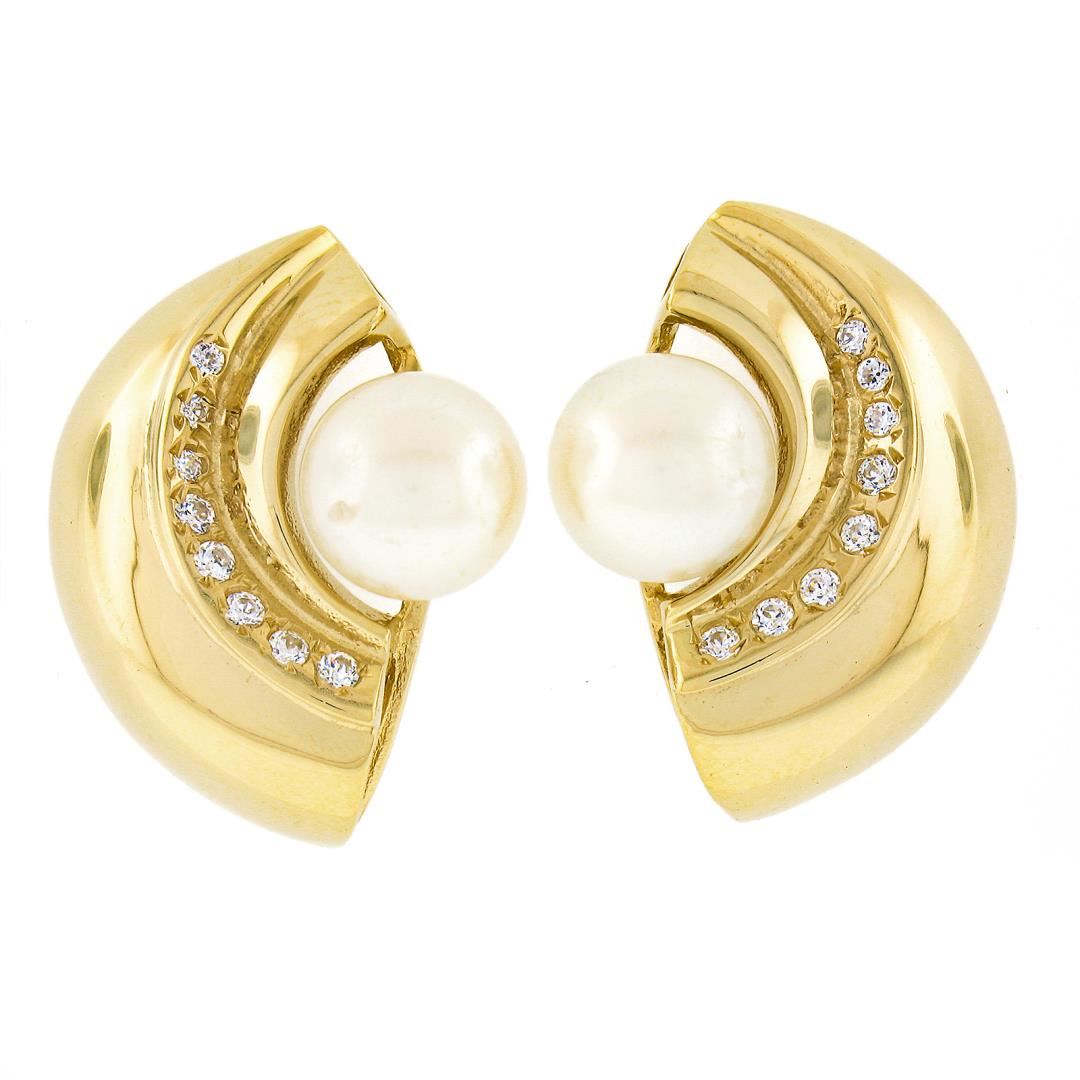 A solid 18k yellow gold half circle earrings, with 2 round shape cultured pearls (8mm each ), and 16 round brilliant cut cubic zirconia. The earrings measure approximately 22.3x18.1mm and weigh a total of 8.41 grams.
