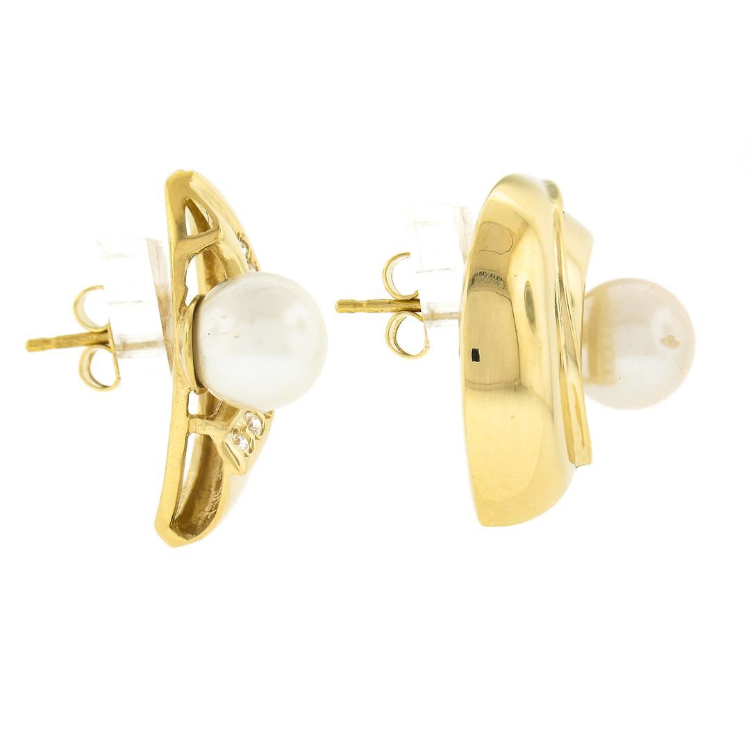 18k Yellow Gold 8mm Pearl & Pave Cubic Zirconia CZ Polished Half Circle Earrings