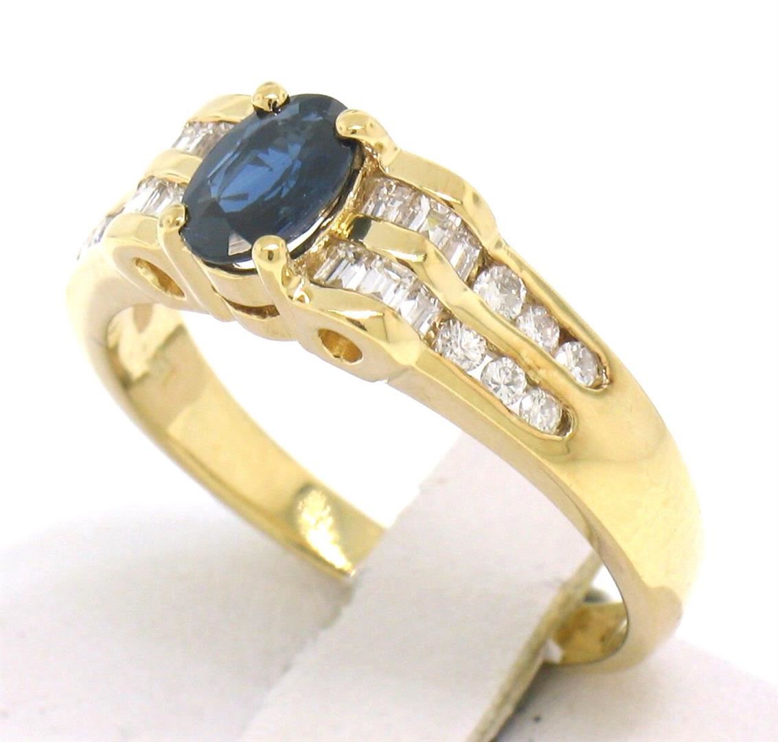 An estate solid 18k yellow gold solitaire ring, featuring 1 oval cut natural sapphire (0.57ct), accented with 24 round brilliant and baguette cut natural diamonds (F/G- VS1/VS2; 0.27ctw). The ring is size 7.5, weighs a total of 4.10 grams, and measures 17.82mm wide.