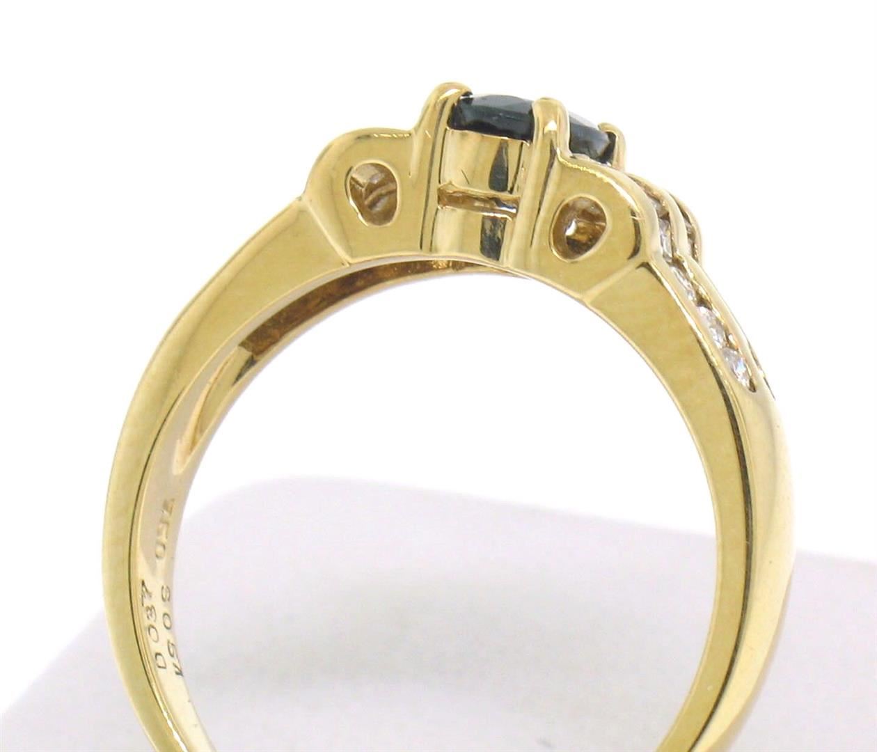 An estate solid 18k yellow gold solitaire ring, featuring 1 oval cut natural sapphire (0.57ct), accented with 24 round brilliant and baguette cut natural diamonds (F/G- VS1/VS2; 0.27ctw). The ring is size 7.5, weighs a total of 4.10 grams, and measures 17.82mm wide.