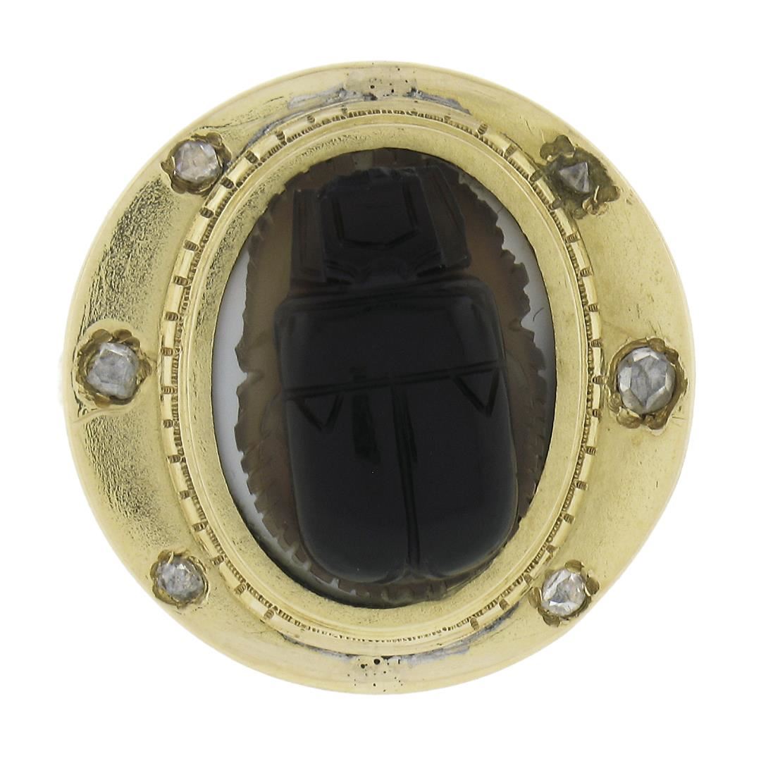 18k Yellow Gold Bezel Set Carved Hard Stone Scarab w/ Rose Cut Diamonds Ring