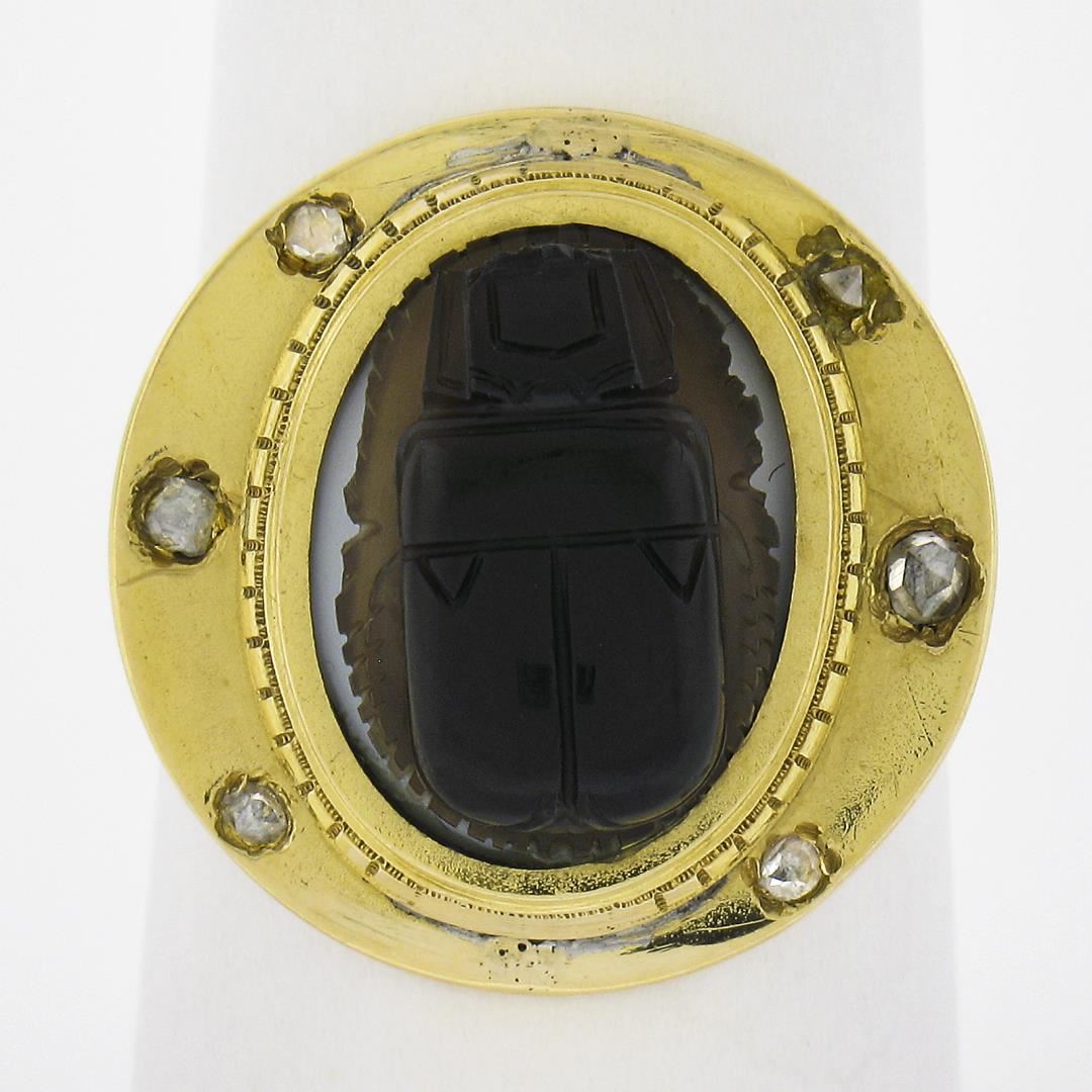 18k Yellow Gold Bezel Set Carved Hard Stone Scarab w/ Rose Cut Diamonds Ring
