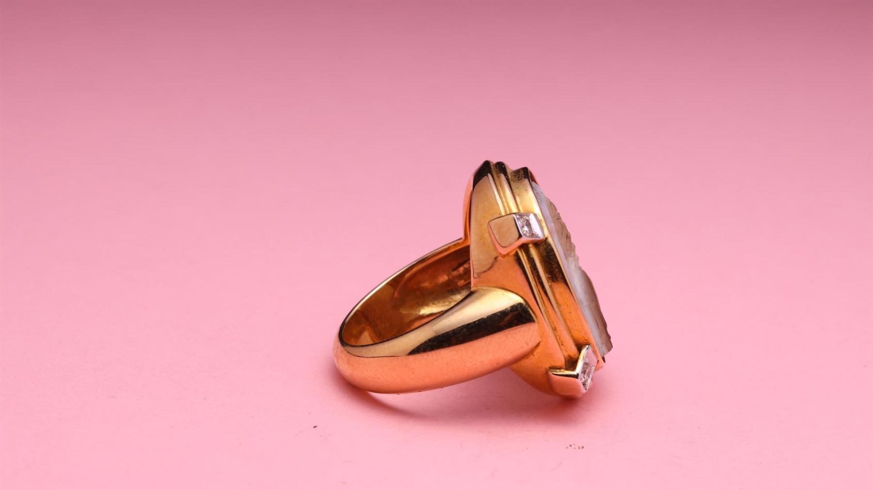 18k yellow gold ring with fine and thinly carved bezel set 19th century cameo agate and four diamond accents in each corner; gross weight 14.9 g, size 7